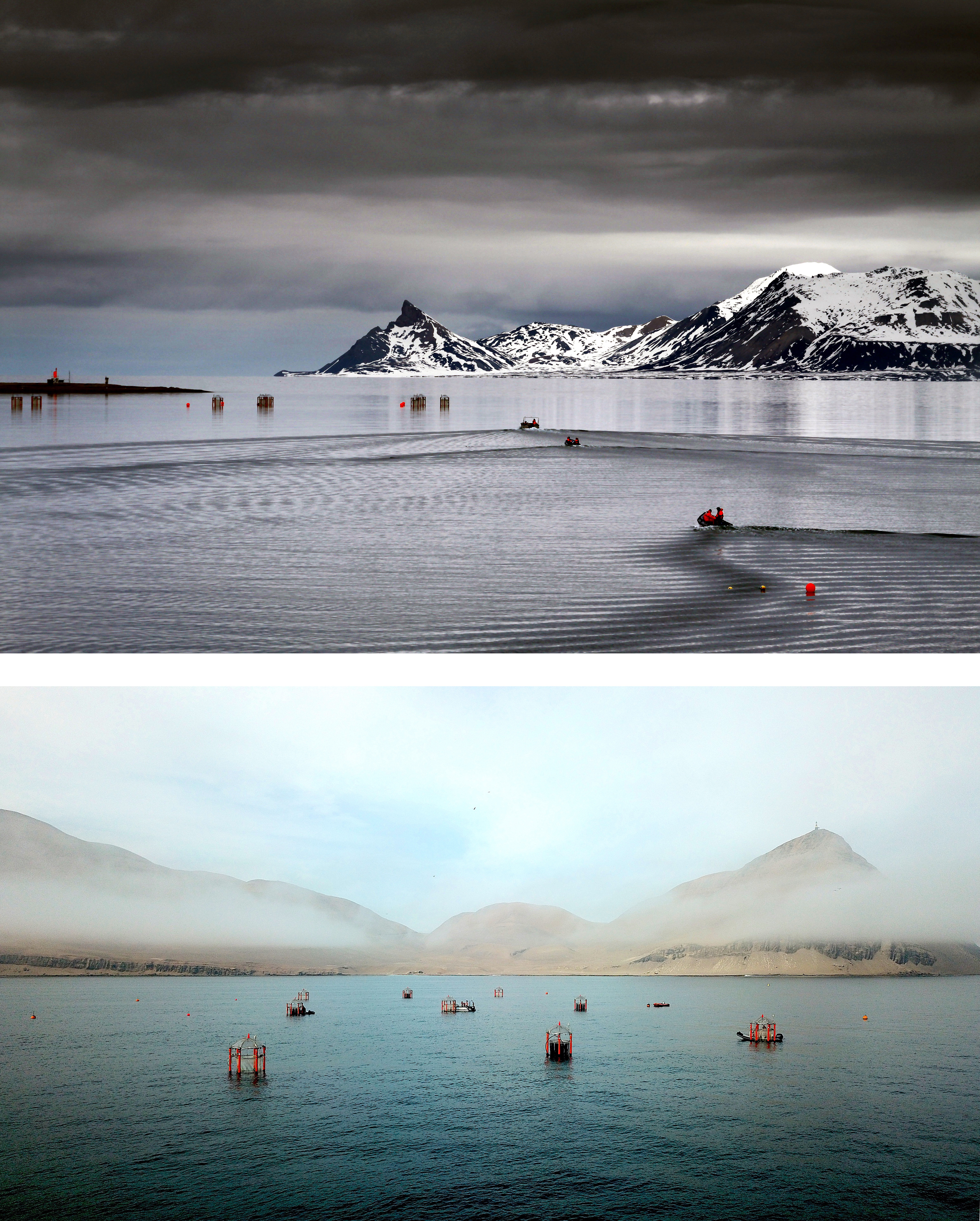 The particle flux was collected by sediment traps connected to the bottom of our mesocosms at 15-25 m water depth. Emptying these traps was always the very first shift in the early morning. While this early hour could mean a boat ride through the dark in Scandinavian winter, the midnight sun was always shining bright in summer over the Kongsfjord in Svalbard at 79°N. On many days, our zodiac was just slicing through calm and perfectly glassy water to the experiment site. However, on other days, heading straight over (and against) 6 to 8 foot waves for an hour, made the trip not only an adrenaline rush, but actually quite exhausting.