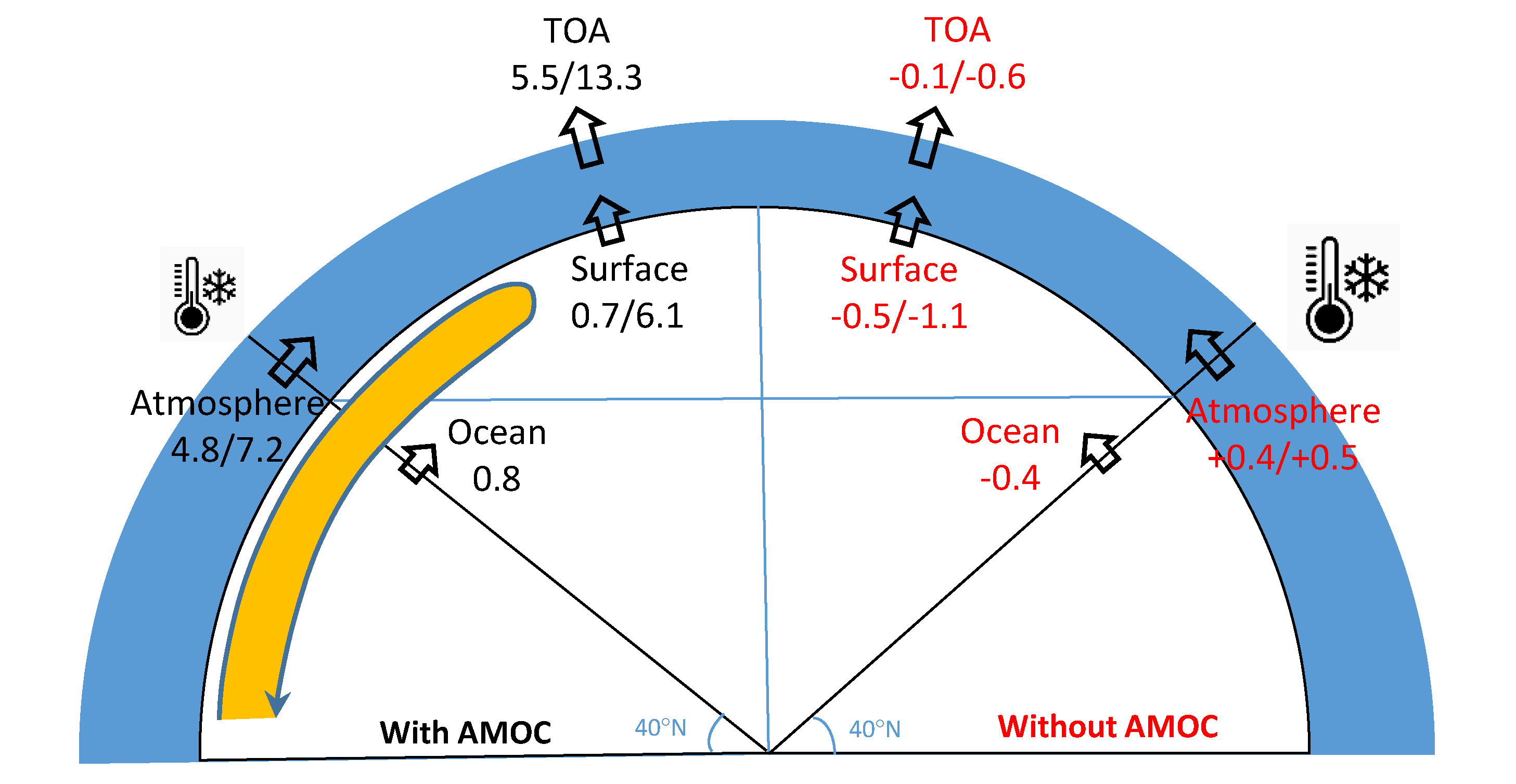 Fig. 1. Schematic shows the model simulated energy balance for the entire atmosphere north of 40°N in the climates with and without an active AMOC. The blue and yellow shadings denote the atmosphere and AMOC, respectively. The left half with black numbers (annual/DJF) shows heat fluxes (PW) at the top, bottom and southern boundaries of the northern atmosphere with an active AMOC. The right half with red numbers shows the heat flux anomalies after the AMOC shutdown. The positive and negative values indicate enhanced and reduced heat fluxes, respectively. Only the annual mean value is shown for the oceanic transport.