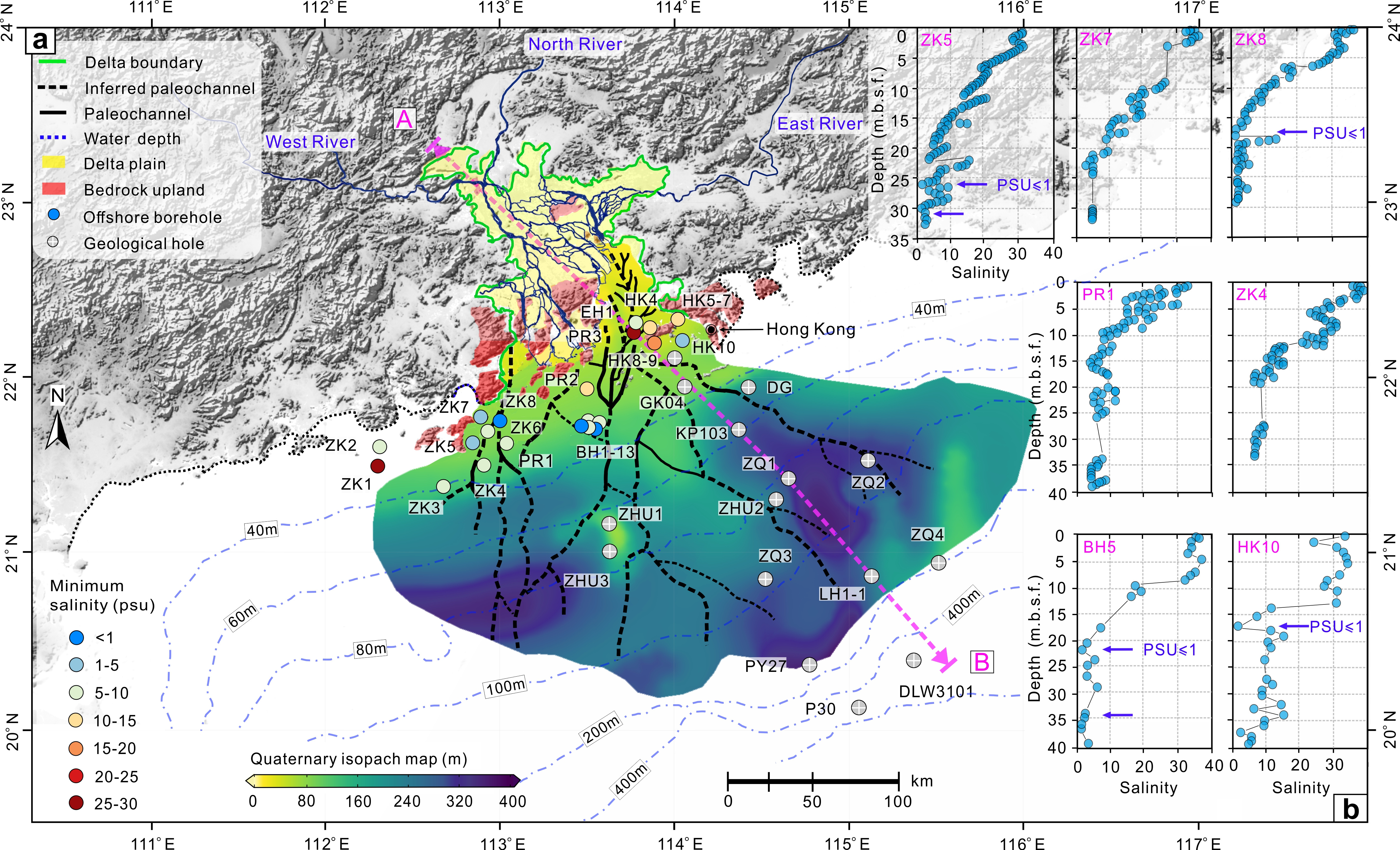 Offshore freshened groundwater in the Pearl River estuary and adjacent shelf | Over the last 20 years, we have undertaken studies on offshore hydrogeology and porewater geochemistry in the paleo-delta of the Pearl River to address scientific issues related to OFG storage. We have first identified OFG around Lantau Island in Hong Kong [Jiao, et al., 2015], then extended our study to the entire South China Sea, with emphasis on the northern continental shelf [Luo et al., 2018]. In recent years, we have accelerated our research on OFG in Pearl River estuary and the adjacent shelf, thanks to financial support from the key program of National Natural Science Foundation of China, Innovation Group Project of Southern Marine Science and Engineering Guangdong Laboratory (Zhuhai), and Hong Kong General Research Fund. To extract porewater for analysis, offshore boreholes were drilled using the ocean drilling vessel “Haiyang Dizhi-10”. Various physio-chemical parameters were then analyzed from the porewater. The calculated static volume of OFG in the inner shelf aquifer system was found to be 61.7 km3. However, it is expected that OFG extends beyond the inner shelf, as the minimum salinity of porewater in the farthest borehole is only 1-9, still well below the salinity of seawater at 30. Using two-dimensional hydrogeologic models, the potential static volume of OFG in the entire subaqueous delta is estimated to be 575.6 ± 44.9 km3.