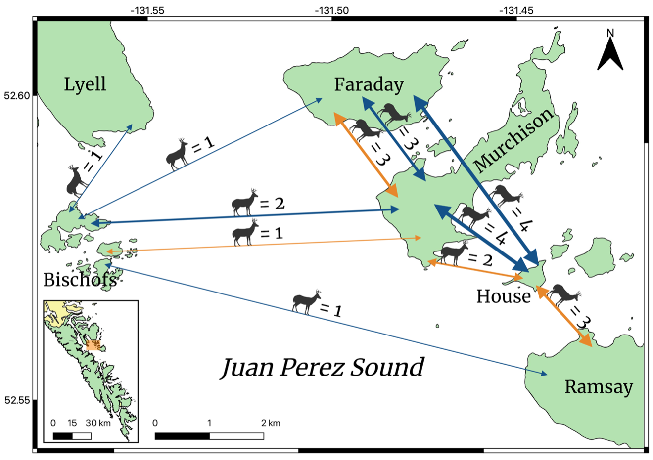 We sought to answer this question, among others, in our recently published study using population genomic data from Sitka black-tailed deer harvested across Haida Gwaii, with an emphasis on deer connectivity within Gwaii Haanas National Park Reserve, National Marine Conservation Area, and Haida Heritage Site. Our findings confirmed previous anecdotal observations of deer movement among islands. In Juan Perez Sound especially, we identified several pairs of first and second order relatives harvested from different islands using a pairwise kinship analysis. In one example, a deer from Faraday was found to be the brother, father, or son of a deer from the Bischofs. Collectively, these inter-island relationships suggest plenty of deer movement among islands in Juan Perez Sound (Fig. 4).
