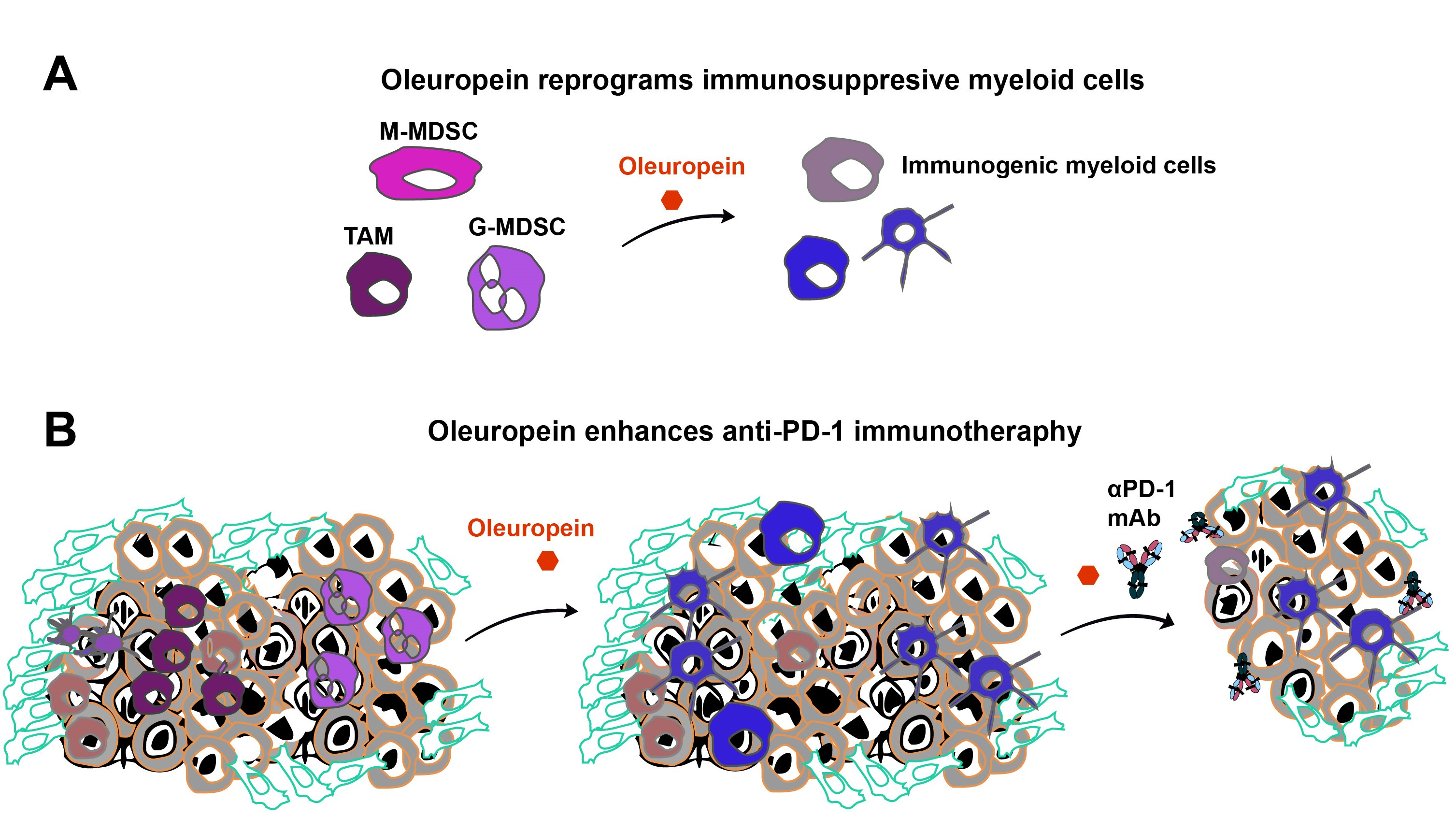 In summary, oleuropein reprograms myeloid cells and convert them in potent immunostimulatory cells with anti-cancer capacities. Importantly, oleuropein may improve anti-PD-1 therapies in patients with tumours resistant to conventional immunotherapies.