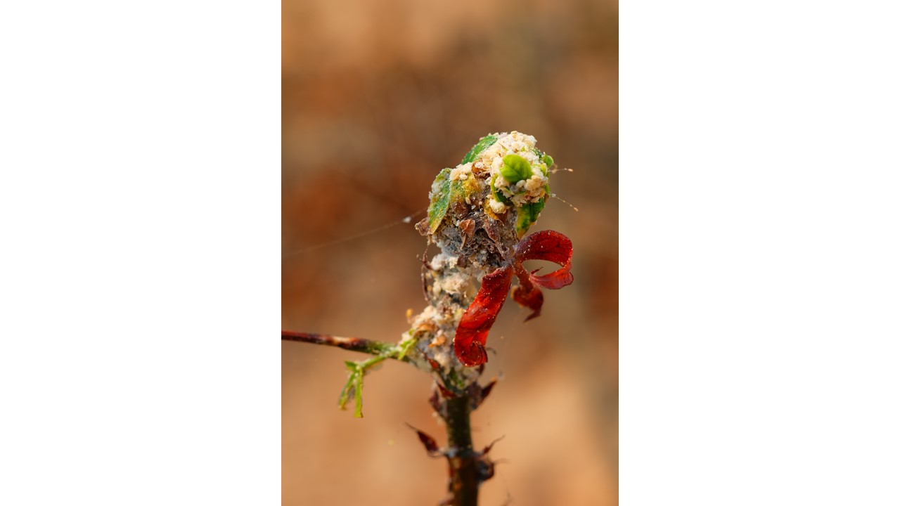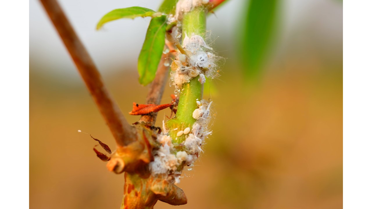 Different species of exotic mealybugs are found on this cassava stem in eastern Thailand. Photo credit: Phanuwat Moonjuntha (Thailand Department of Agriculture).