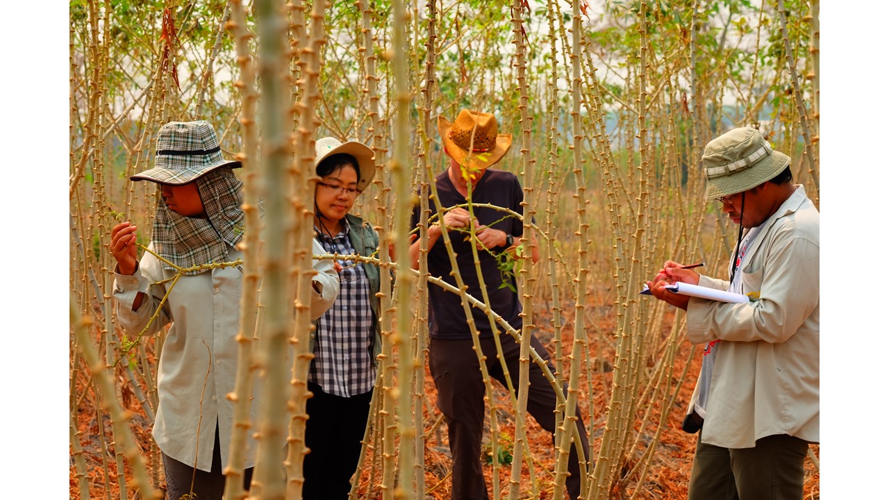 During 2014-15, trained surveillance teams screened >500 cassava fields across the Greater Mekong sub-region, recording mealybug infestation pressure and establishment rates of Anagyrus lopezi; here a field is visited in northwestern Thailand. Photo credit: Phanuwat Moonjuntha (Thailand Department of Agriculture).