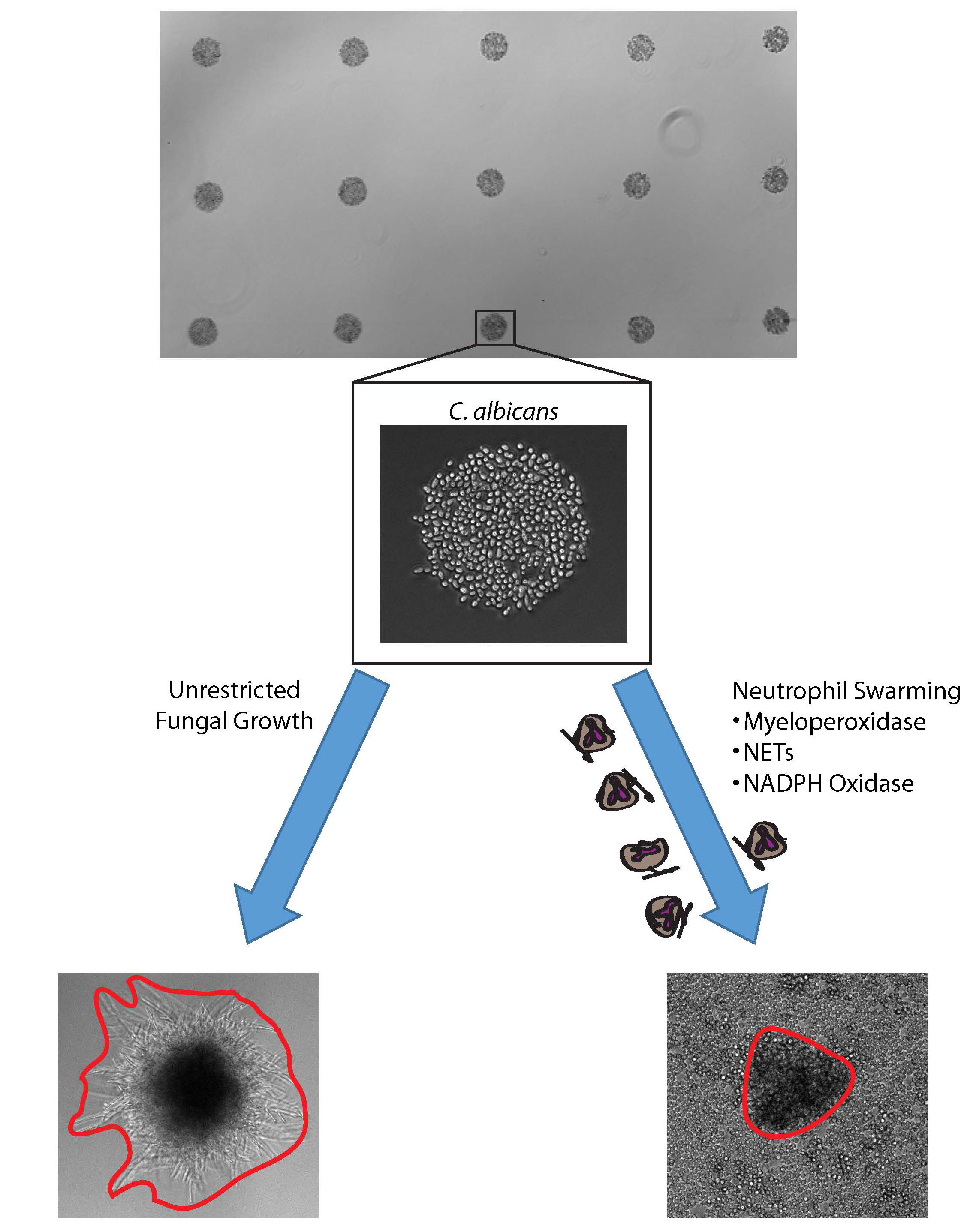 We created an ex vivo assay in which hundreds of fungal clusters are presented to human neutrophils. We chose Candida albicans as the prey for our studies. C. albicans represents one of the most common causes of opportunistic fungal infections in humans. C. albicans infections range from the relatively common vaginal yeast infection and oral thrush to life-threatening invasive candidiasis.