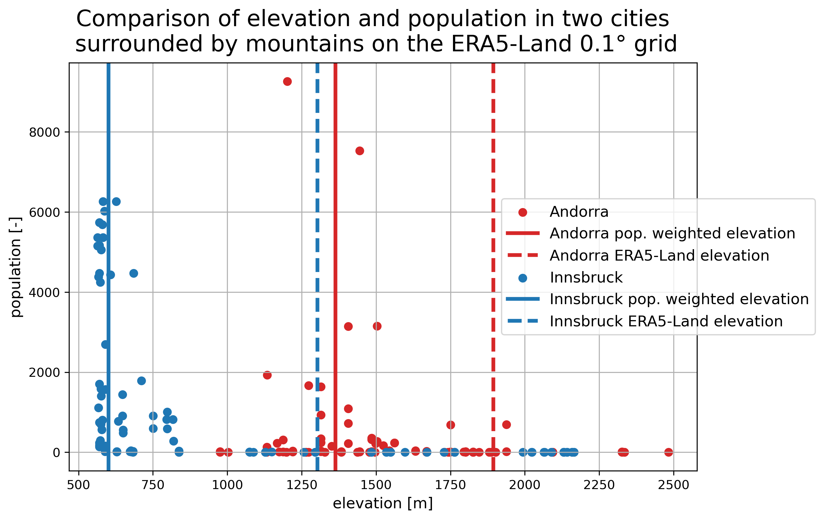 mountains, distinguished by color. The elevation of the closest ERA5-Land pixel is marked with a dashed line in the same color, while the population weighted elevation is shown as solid line.