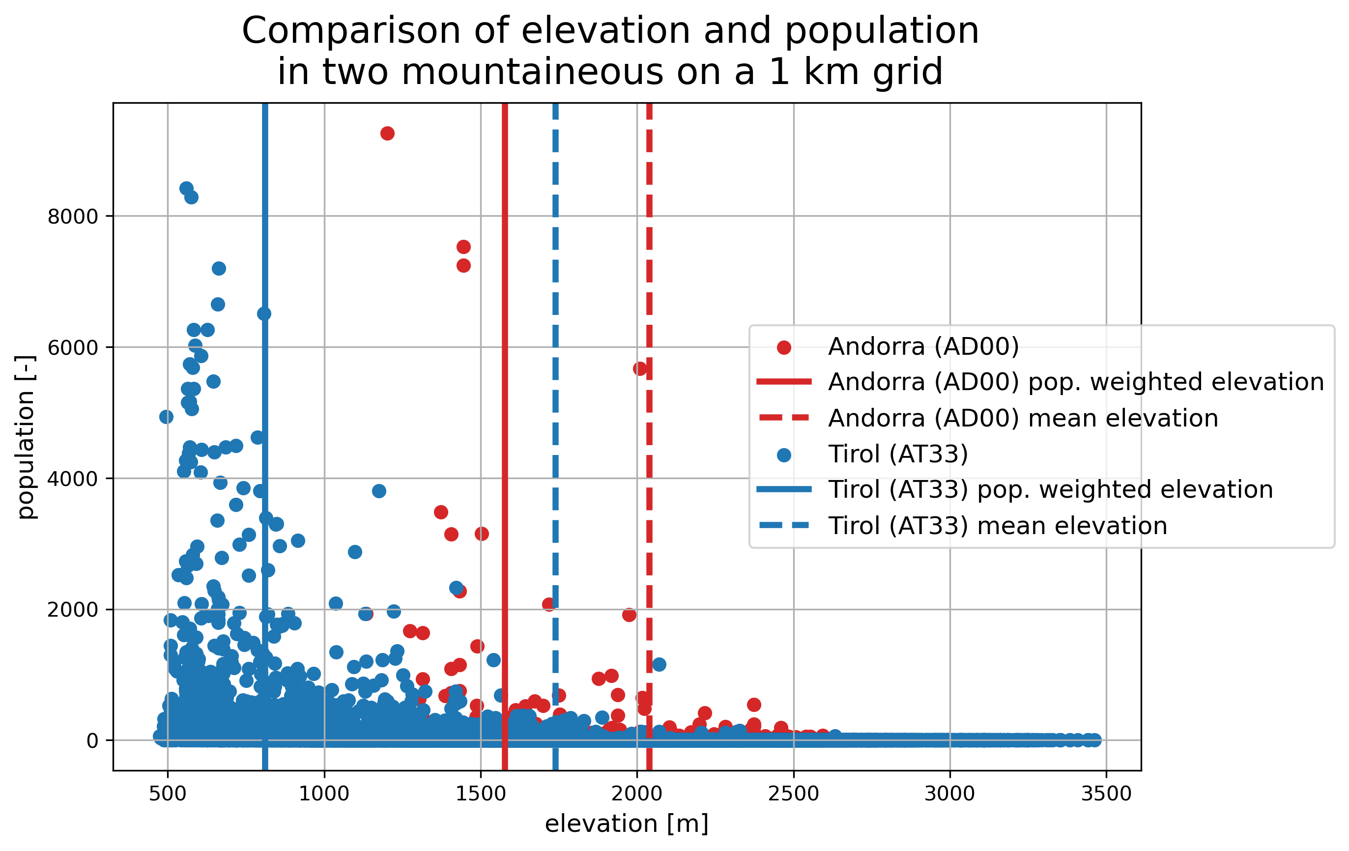 Figure 2: Comparison of elevation in metres and population in two selected, mountainous NUTS2 regions (NUTS code visible in the brackets), distinguished by color. The mean elevation of the region is marked with a dashed line in the same color, while the population weighted elevation is shown as solid line.