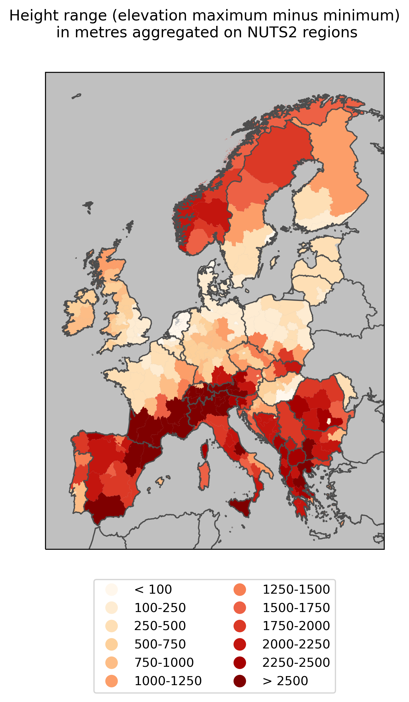 Figure 4: Height range in metres aggregated on NUTS2 regions in Europe. Displayed in color is