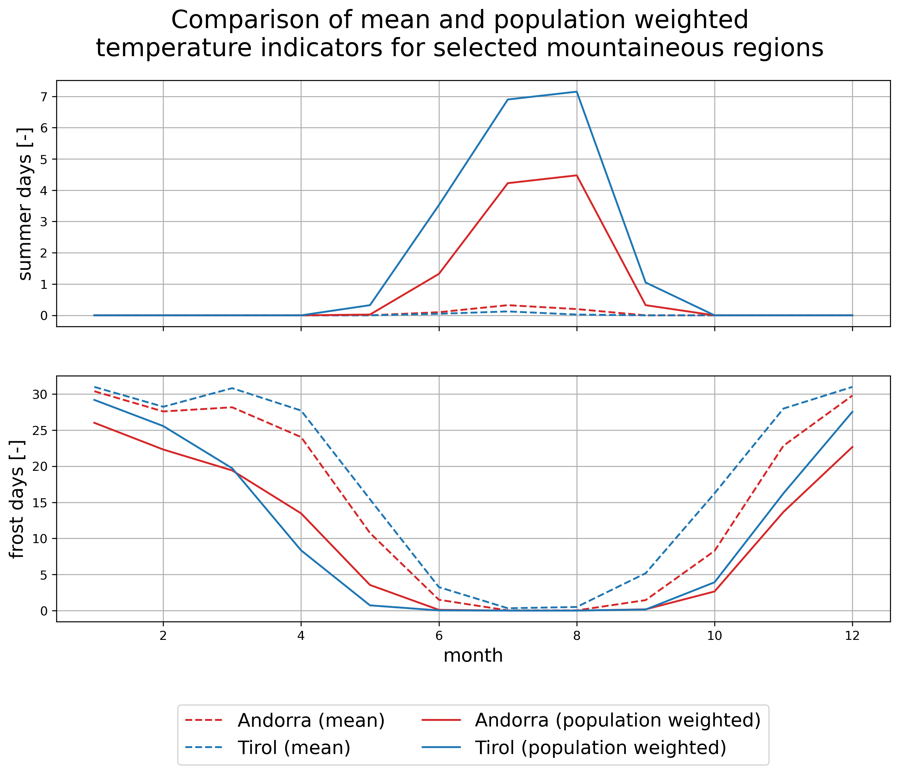 Figure 3: Temperature indicators for two selected, mountainous NUTS2 regions, distinguished by color. Conventional spatial mean is marked by dashed lines, whereas population weighted mean is marked by solid ones. Shown are summer days with temperatures above 25°C (top) and frost days with temperatures below freezing level (bottom).