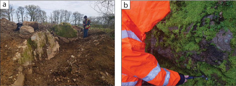 Fieldwork in the Limousin region of Massif Central, France, in search for lithium-rich rhyolitic dikes with Éric. a) One of the few photos in the field where Éric is (partly) facing in the direction of the camera, instead of the rocks. b) The remarkable outcrop exposure of Limousin often requires the removal of vegetation to reveal the hidden underlying rocks. Images were taken by B. Horányi.