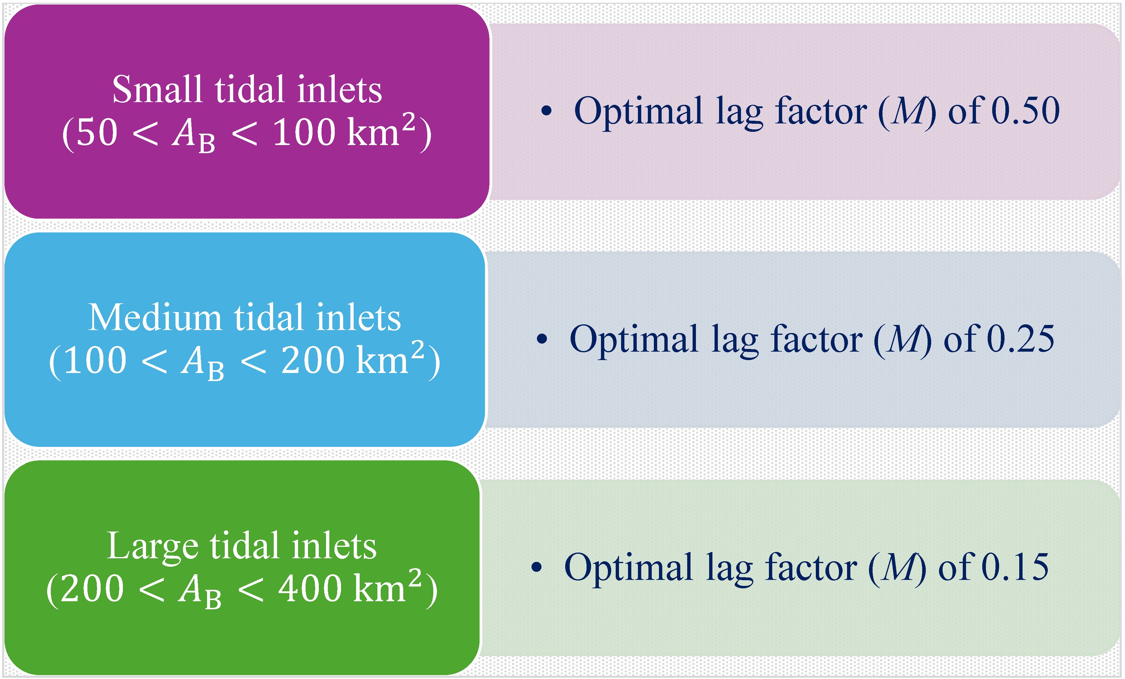 The lag factor (M) between sea-level rise and basin infilling depends on the estuary's surface area. Based on a quality-controlled estuary dataset, here, we clustered the inlet-estuary systems into three classes by considering the surface area (AB). For the first time, using analytical considerations, we derive indicative optimal lag factors (i.e., M values) for the above-identified three estuary classes.