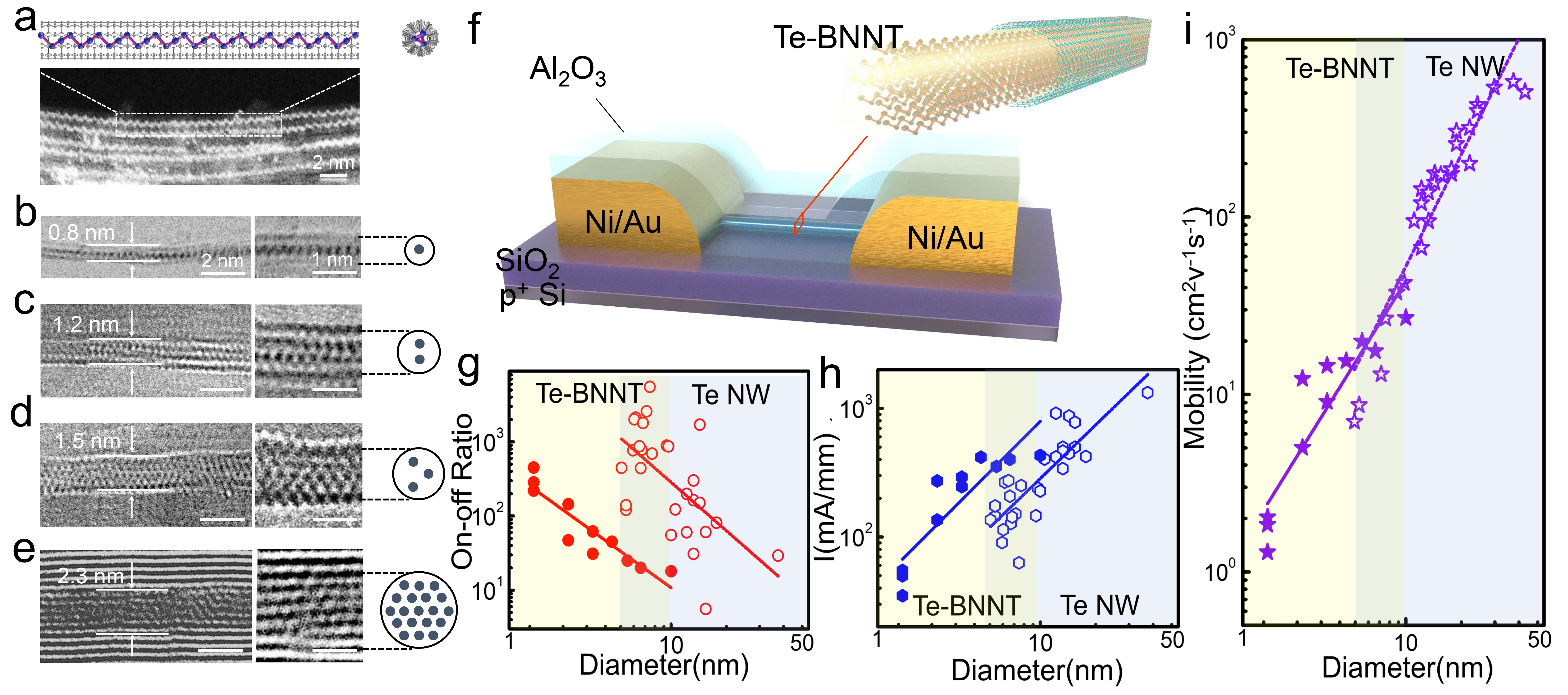Fig. 1 | Characterization and transport properties of Te NW isolated down to few-chain limit. a, HAADF-STEM image of single Te chain in 0.8 nm SWCNT, where clear 3-fold-symmetry helical coils are distinguished. Inset image shows the corresponding schematic illustration. b-e, HRTEM images of the single, double, triple and 19 chains of Te shielded by CNT. f, Schematic of an individual Te-BNNT FET. Diameter-dependent g, on-off ratio h, current density at Vds=1 V and i, carrier mobility of Te-BNNTs and Te NWs short-channel FETs. Solid signs represent Te-BNNT NW devices and empty signs represent bare Te NW devices.