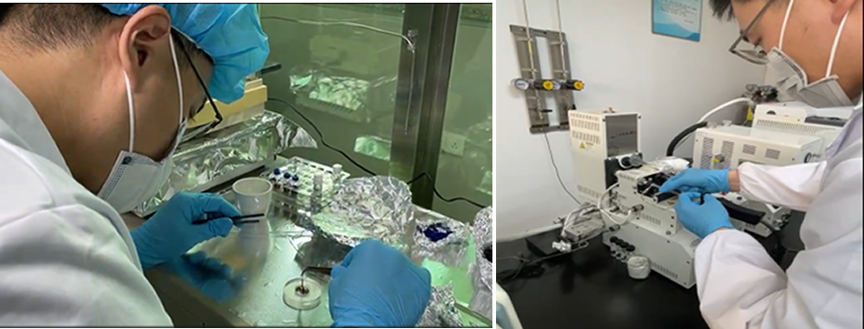 We were excited to be allocated 6 grams of Chang’E 5 lunar soil for the search of organic matter. Our primary concern was terrestrial contamination, because it could lead to a failure to detect any lunar organics. A Class 1000 clean lab was necessary for our analysis, but quickly building such a clean lab was tough during the pandemic. Fortunately, Class 1000 clean booths were commonly used in local electronics manufacturing. So, we asked a local manufacturer to rapidly build such a booth for us, mainly composed of stainless steel and glass to prevent organic contamination.