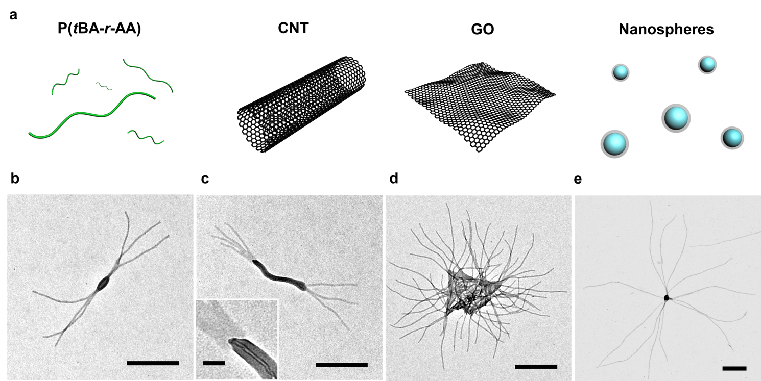 Figure 2. The initiated assembly by macromolecular initiators. (a) Schematic cartoons of the different large initiators. (b-e) The TEM images of the hierarchical structures initiated by (b) P(tBA-r-AA) (RI = 2 wt.%; CP = 0.05 mg/mL) (c) CNTs (RI = 10 wt.%; CP = 0.025 mg/mL); (d) GOs (RI = 2 wt.%; CP = 0.05 mg/mL), and (e) PS nanospheres (NS, RI = 2 wt.%; CP = 0.025 mg/mL). Scale bars are 500 nm, and 50 nm in the inset.