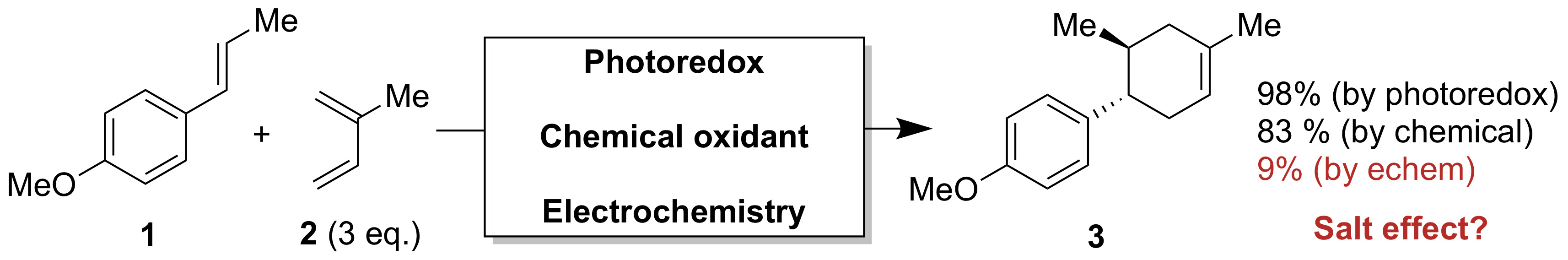 For example, hole catalytic Diels-Alder reaction (a.k.a. radical cation Diels-Alder reaction) proceeds smoothly under photoredox catalysis [2] or chemical oxidations. However, an electrochemical equivalent reaction in 0.1 M Bu4NTfO/DCM is low-yielding despite the same amount of hole injection compared to chemical oxidation (Figure 1). This result caught our attention, and we started to think a reasonable explanation for this phenomena. "What is the difference between electrochemistry and other oxidation systems?" Well, hindsight is 20/20. It is salt.