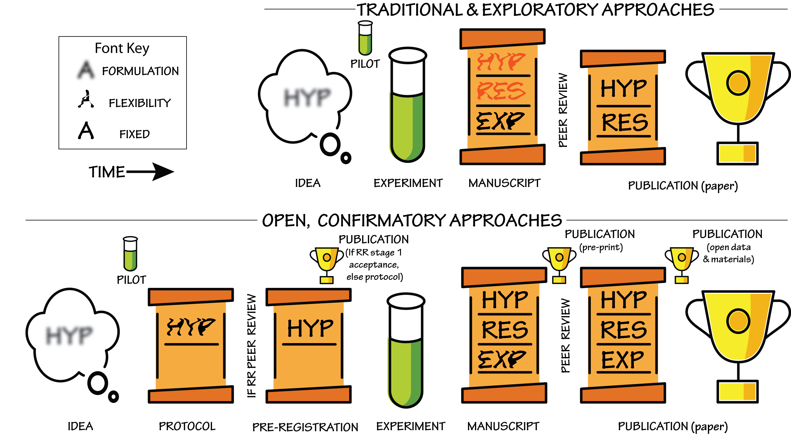 Markedly more demanding is the adoption of preregistration, which involves a public declaration of methods and hypotheses before data collection. Hypotheses are only really hypotheses before the data is looked at. At the heart of preregistration lies the distinction between confirmation and exploration, with an emphasis on apriori methods and predictions. This distinction is not always explicit and researchers often explore data after collection. Maintaining ambiguity between confirmatory and exploratory research could convey advantages if researchers paint easily made data observations as planned tests of hypotheses to create a publishable narrative with positive results (HARKing). We don’t suggest there is anything wrong with exploratory studies. Well-defined research (e.g. replications) may suit preregistration better than complex or qualitative questions that can be more compatible with an exploratory approach. Nonetheless, we encourage academics and journals to enforce an explicit distinction between confirmatory and exploratory research. In our experience, the largest cost of rigorous preregistration is time due to preparing experiments, anticipating outcomes and developing analyses before data collection. This can lead to fewer (but potentially higher quality) publications.