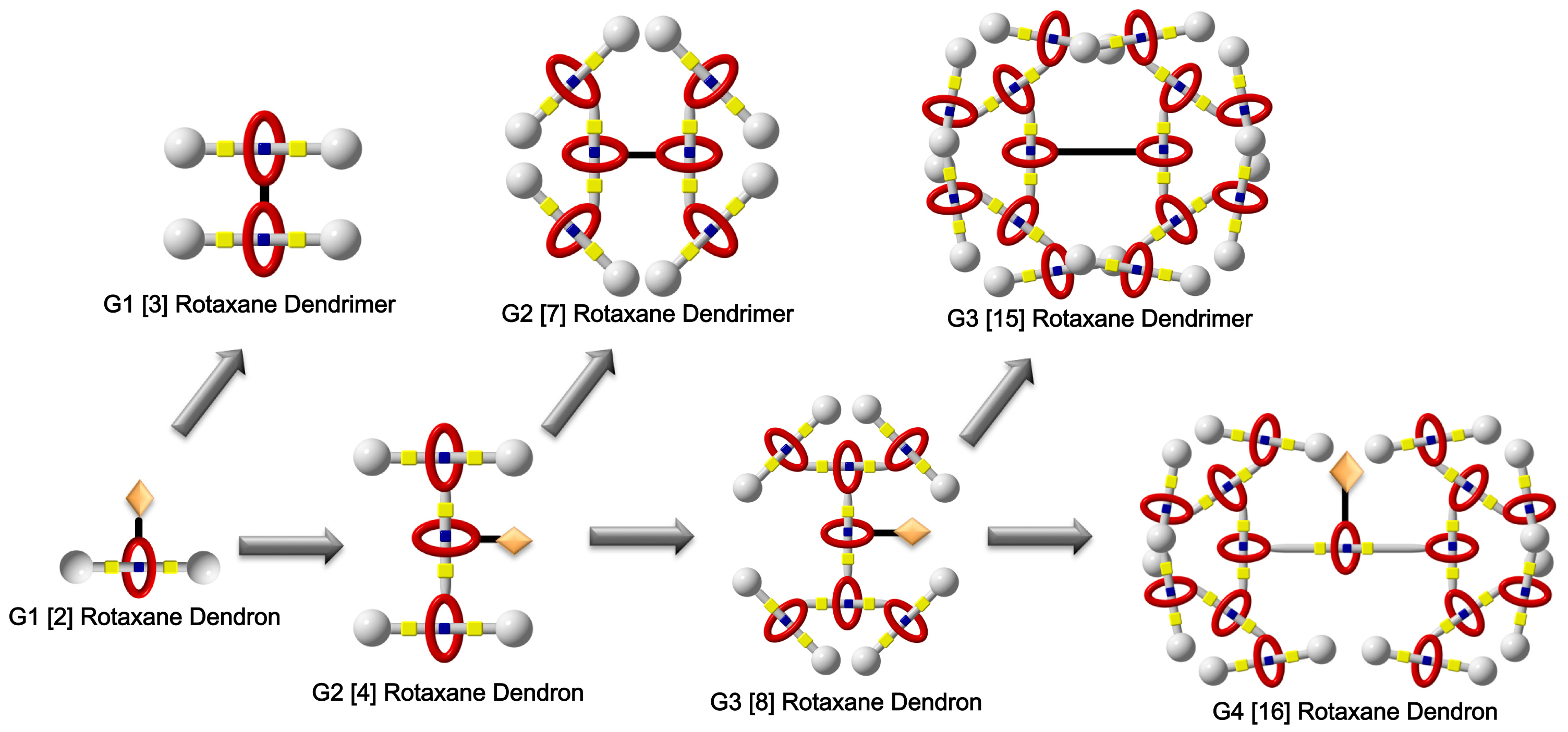 Rotaxane dendrimers are molecular interlocked molecules that combine hyperbranched macromolecules with molecular machines. Among various types of rotaxane dendrimer, type III-B possesses the most complicated molecular structure and exhibits the largest extension-contraction properties. The syntheses of most compounds required the in situ rotaxane formation followed by careful purification. The breakthrough in the high-yielding synthesis and the control of particle size of higher-generation rotaxane dendrimers could give scientists an insight to develop more sophisticated molecular machines to be applied in functional materials and nanotechnology, such as the delivery of drugs or biomolecules.