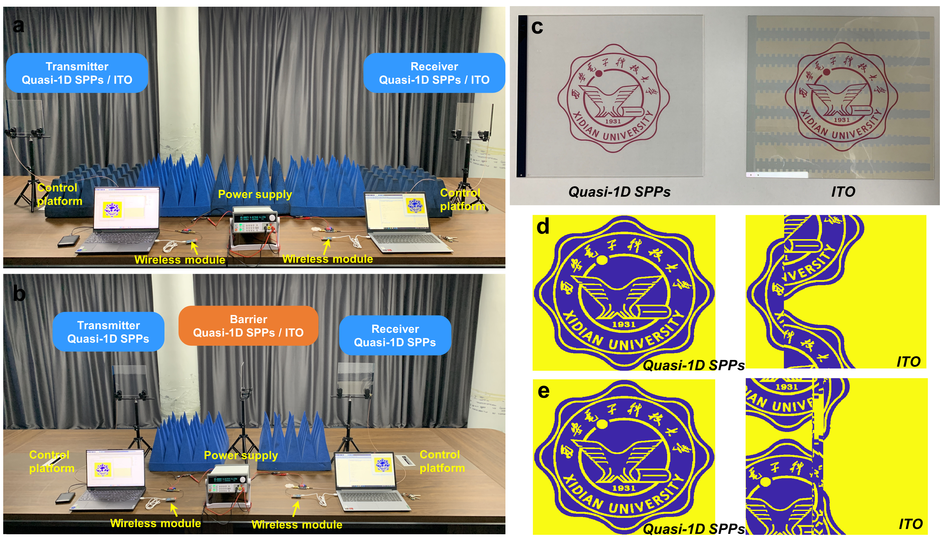Figure 3c exhibits the comparison photographs of the fabricated quasi-1D SPPs transceiver and ITO transceiver, and the square resistance of ITO is 1 Ω/square, which is a common value in high-conductivity devices. Obviously, the quasi-1D SPPs transceiver has higher optical transmittance, and this method not only brings the optical transmittance improvement, but also presents an invisible configuration. Figure 3d depicts the comparison of image quality between the quasi-1D SPPs based and the ITO based data transfer systems without the barrier. Since the traditional method relying on ITO is subject to the materials’ intrinsic properties: conductivity (carrier density) and optical transparency are mutually restricted, even if the ITO with high conductivity (1 Ω/square) is adopted, the operation efficiency in wireless communication systems will deteriorate extremely , which leads to a sharp drop in signal strength and communication distance, and the image received by the ITO system is severely distorted. Figure 3e demonstrates the comparison of image quality between quasi-1D SPPs/ITO barriers. ITO is unable to possess RF transparency, hence ITO-based devices will block the communication of other devices, which is not conducive to the integration of communication systems. Therefore, using the quasi-1D SPPs transceiver in the communication path can obtain excellent communication quality, while adopting the ITO devices will greatly deteriorate the data transmission and against the integrated communication.