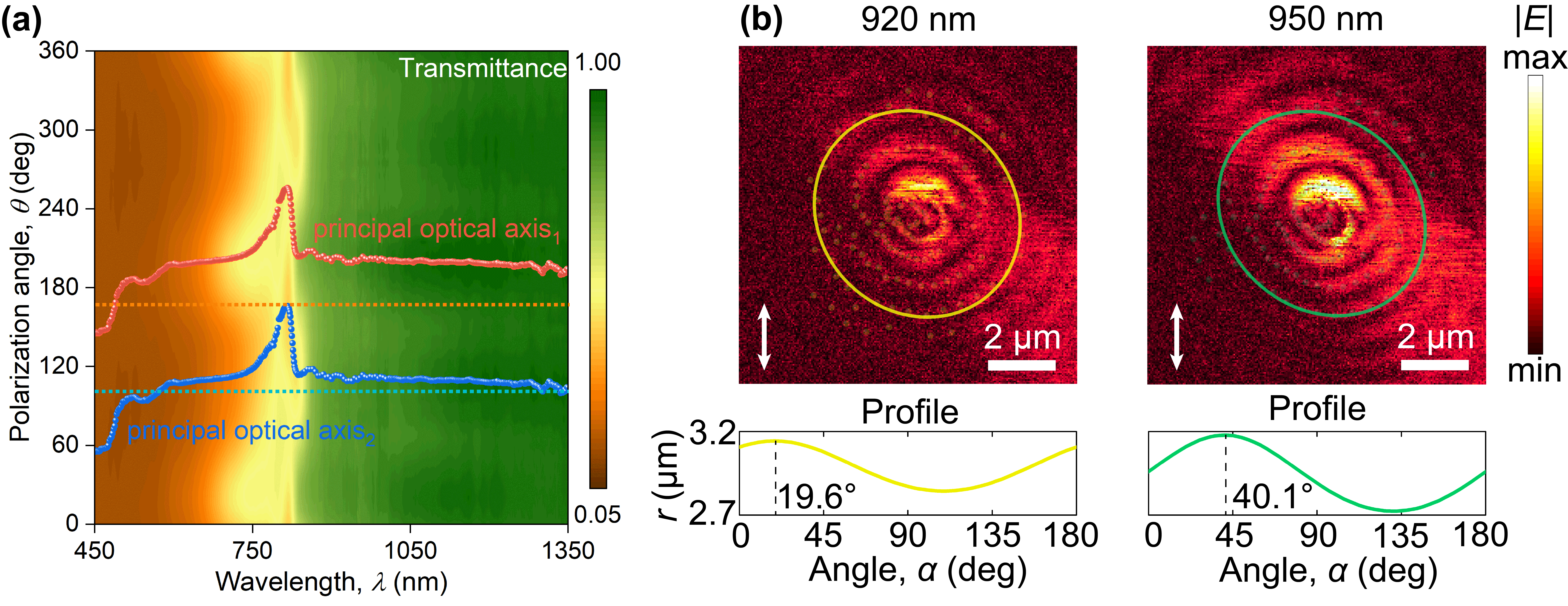 The wandering of optical axes can be observed in both far- and near-field experiments. In far-field measurements, the wandering of optical axes results in the change of positions of maximums and minimums observed in polarization dependent transmittance spectra of triclinic van der Waals materials (see Fig. 2a). On the other hand, near-field scanning optical microscopy measurements (see Fig. 2b) reveal wavelength-dependent propagation directions of their waveguides modes. Therefore, the effect of wandering optical axes gives an indispensable way for the manipulation of light.