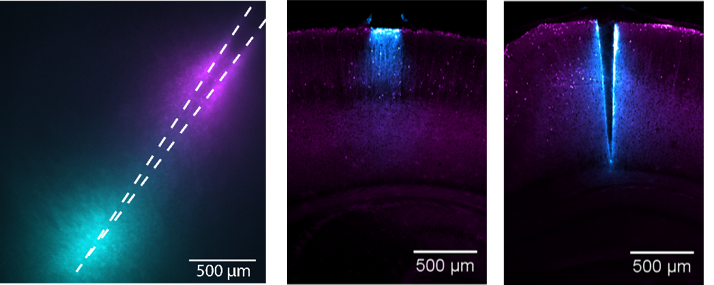 Example of multipoint illumination of brain tissue (left) and examples of the light fields collected from a traditional flat cleaved fiber optic (center) and a tapered optical fiber (right). The multipoint illumination image is a merge of two fluorescence images displaying independently illuminated regions (light blue and magenta). Light collection fields are obtained by merging a standard two-photon epifluorescence image (magenta) with the image that is generated when light is collected through the fibers (cyan).
