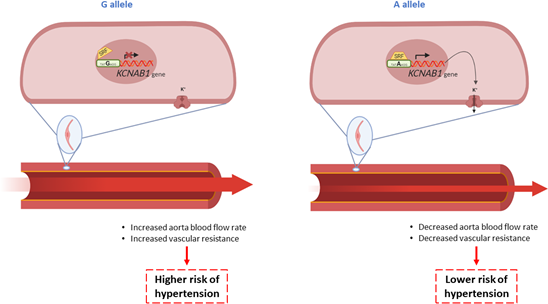 Interestingly, the genes related to the most statistically significant genetic variants selected based on pre-specified criteria have consistent biology with the phenotypes herein investigated. For example, our top hit discovered in the GWAS analysis for bevacizumab-induced hypertension and validated in the additional cohort was rs6770663, an intronic genetic variant in a gene that encodes a subunit of the K+ channel, KCNAB1, the deletion of which is associated with elevated blood pressure2. From a mechanistic perspective, the serum response factor (SRF), a cardiac-enriched transcription factor, is more likely to bind the major allele A than the minor allele G of rs67706633, possibly activating the transcription of KCNAB14. Our proposed mechanism is that in patients with the G allele of rs6770663, lower activation of KCNAB1, impaired activation of the K+ voltage-activated channel, and increased vasoconstriction results in an increased risk of bevacizumab-induced hypertension. We have illustrated this putative model in the figure below.