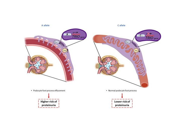 Proposed mechanism of rs339947 close to TRIO in a podocyte for bevacizumab-induced proteinuria. (Created with BioRender.com.)