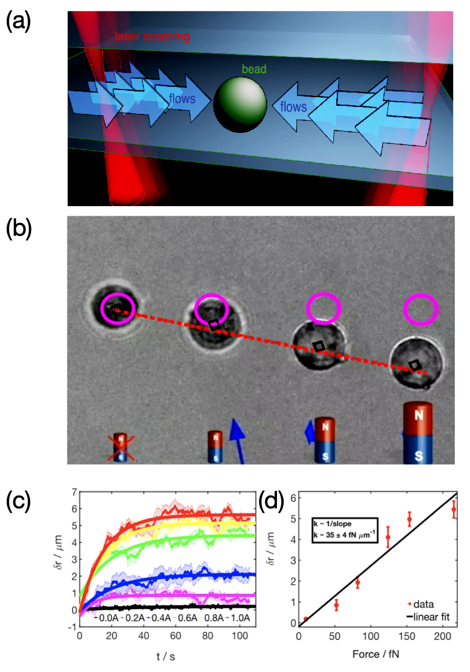 In our new method, we aimed to address many of the aforementioned challenges. Through the rapid scanning of a laser on both sides of a particle, we successfully formed via optical means a hydrodynamic trap at the particle position, which coincides with the stagnation point of the flow profile (see Fig. 2a). Thus, we were able to establish a linear force-extension relationship and measure femtoNewton-range forces that we obtained through a fine balance between our optofluidic forces and an external magnetic force (Figs. 2b-d). This hybrid approach leverages the optical control capabilities of optical tweezers with the non-invasive and contact-free nature of hydrodynamic trapping, thereby also lifting the limitations related to particle material, local heating, geometric constraints and spatially invariant stagnation point. In other words, I believe it allowed us to make a substantial advancement to the field of micromanipulation that holds great potential for determining important cause-and-effect relationships in the life sciences.