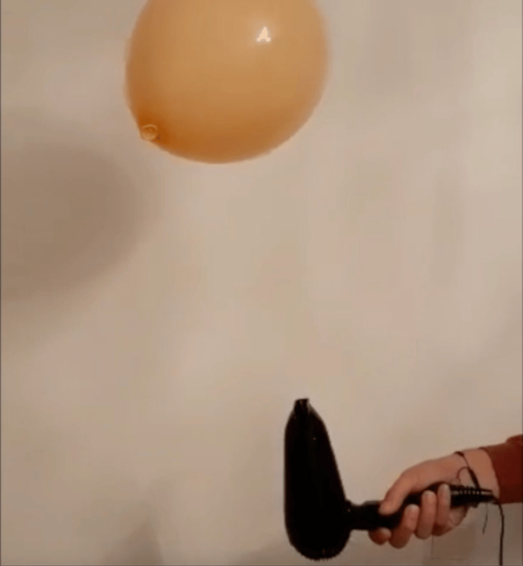 Figure 1 | Macroscopic visualisations of force balance: (left) balancing a balloon with a hairdryer, and (right) balancing a ping-pong ball with compressed air.