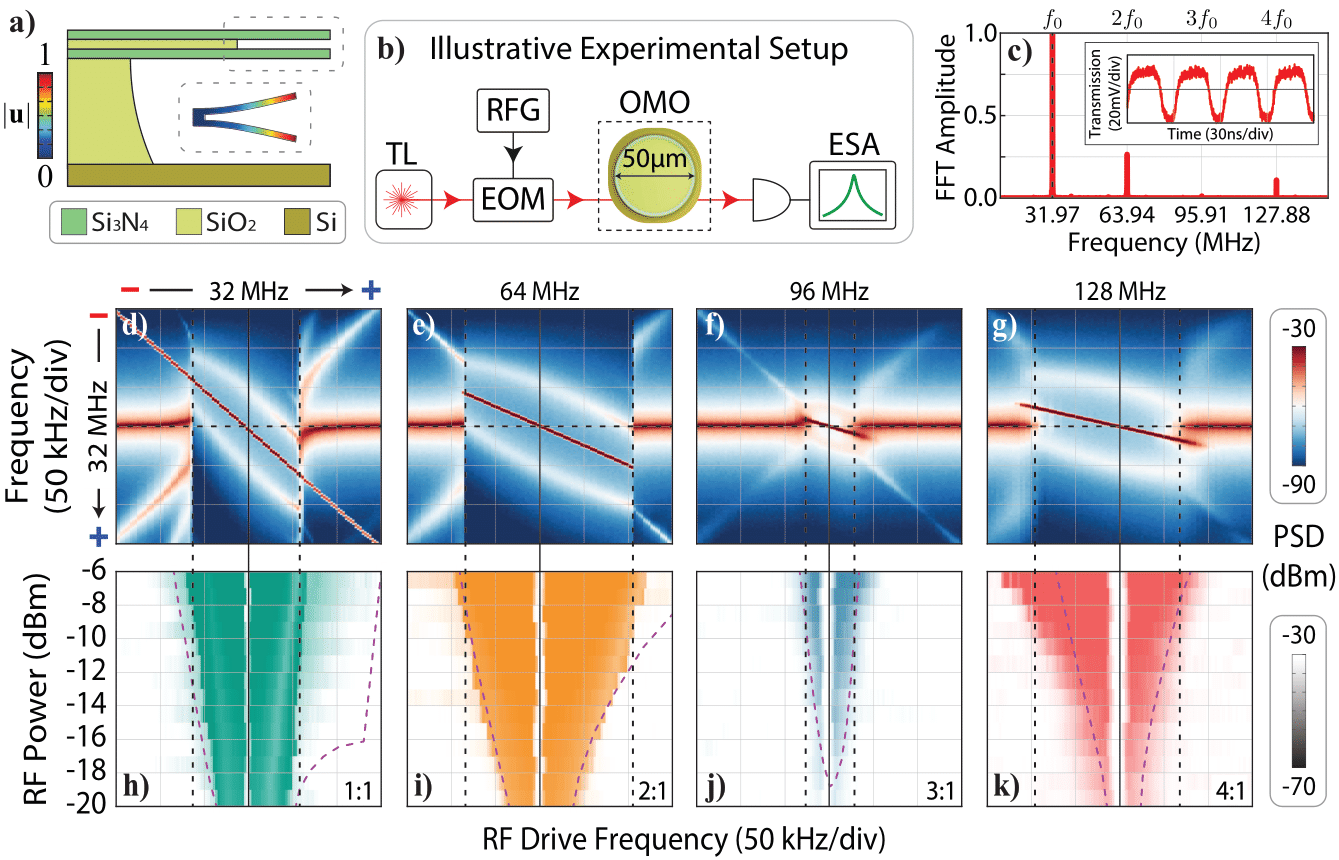 Here I quote a phrase from my favorite book on the topic "Synchronization: A Universal Concept in Nonlinear Science" which says "It is important to mention that high-order tongues are typically very narrow so that it is very difficult (if not impossible) to observe them experimentally" - Arkady Pikovsky. This is absolutely true in our resonator-based oscillator, we couldn't observe high-order synchronization until a certain level of both optical power and modulation depth thresholds. The interesting fact is that these thresholds were not particularly high, we were actually very close to the threshold optical power required to reach the oscillation limit cycle of the system. Furthermore, even a modulation of just 4% was enough to observe wider tongues when driving at even multiples of the oscillator frequency, in comparison with the fundamental one. This is a statement that our system can operate in a very nonlinear regime, despite the mechanical resonator itself being a linear one. This is so because the large optical frequency shifts induced by the mechanical motion creates harmonics (and subharmonics) of the signal’s radiation pressure force, significantly enhancing the non-linearities perceived by the mechanical system. This "even-harmonic characteristic" also comes from the fact that an energy potential of the form U = x2 + x4 emerges naturally from the optical force, which show us a really strong parametric effect, similar to those present in a Duffing oscillator, as we analytically shown in the article.
