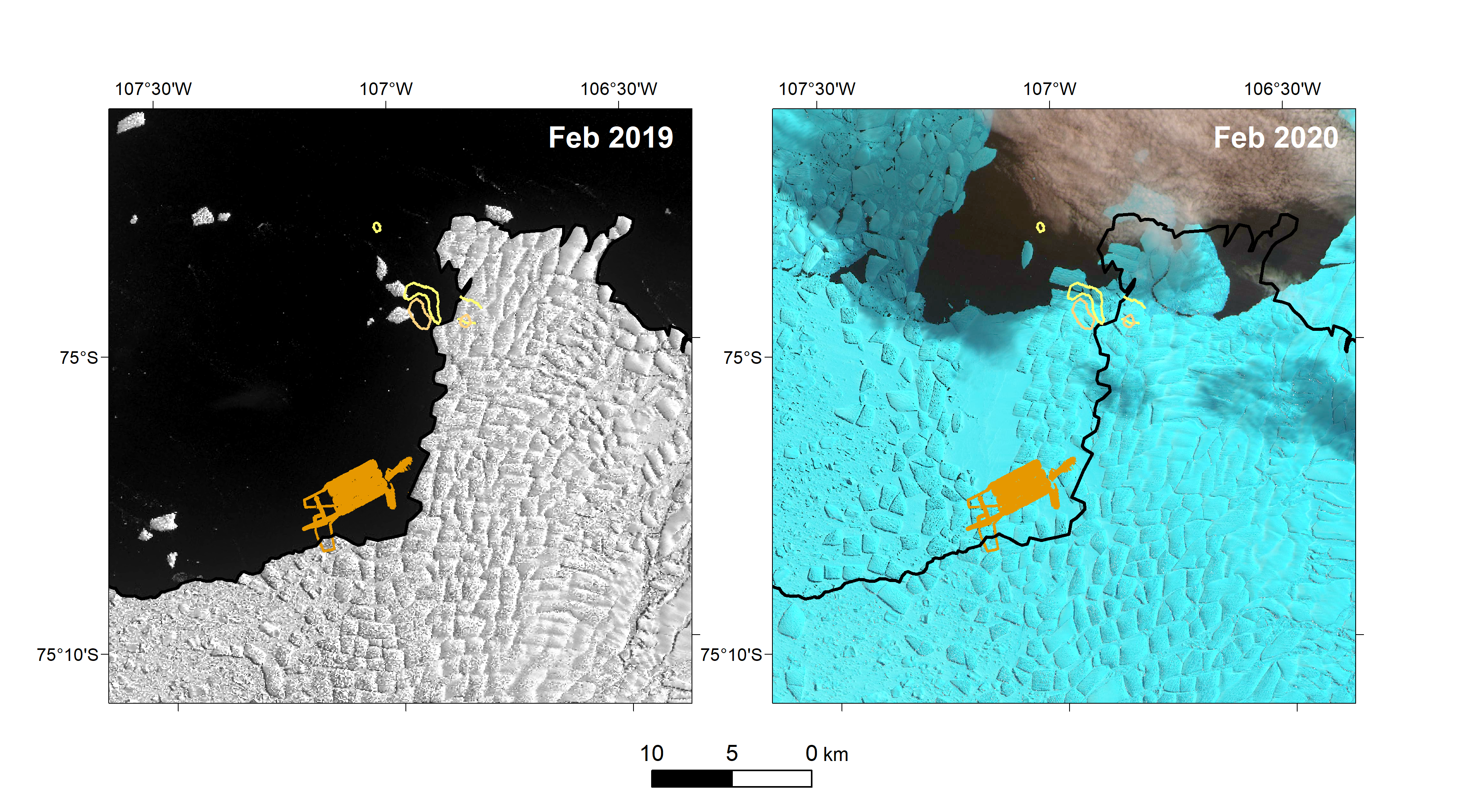 Accessing this landscape, however, poses significant challenges. The sought-after archive of past change at Thwaites is submerged many hundreds of metres beneath the polar ocean. In any given year, the coastal vicinity of the glacier is usually encased by a wide band of fast ice on the ocean surface. Historical ice limits digitised from satellite images record the repeated advance and calving of the Thwaites Ice Tongue9 that periodically produced enormous icebergs – for example, the 40-mile wide B-22 iceberg that calved in 2002 – that have consistently restricted access for vessels and have served to retain and solidify an impenetrable and persistent floating ice melange.
