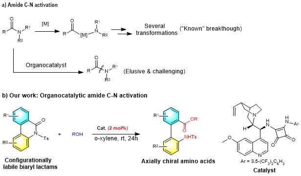 We embarked on a search for organocatalytic solutions to solve the challenging problem of amide bond activation based on our understanding of organocatalysis. Configurationally labile biaryl lactams attracted our attention because of its enhanced reactivity by torsional strain. We hope the amide C-N bond can be activated and cleaved in a stereoselective attack manner with the assistance of organocatalyst. Notably, if alcohol is used as a nucleophile, this catalytic strategy can provide a conceptually new and practical approach to a structurally diverse set of axially chiral biaryl amino acids. Unlike well studied centrally chiral amino acids, there have been fewer reports on the synthesis and application of axially chiral amino acids, although their derivatives are frequently found in natural products and bioactive compounds. Before our initial attempt, we mainly considered two key problems: (i) because of the resonance stability of the amide bond, the intrinsic torsional strain of the substrate is probably not enough to activate the secondary amide C-N bond. The introduction of electron-withdrawing groups (e.g., N-Ts, N-Boc, N-Cbz etc) into nitrogen atom is worthy of careful investigation. (ii) the selected organocatalyst not only be able to control the stereoselectivity of the reaction, but also be efficient to enhance the activity of the amides to a certain extent.