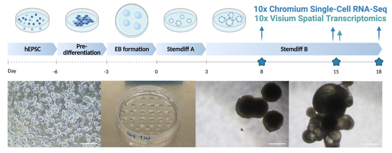 HEMOs recapitulated fundamental events in human embryos. Through morphogens and cytokines exposure, HEMOs generated cardiac precursors, neural crest, blood, placenta and yolk sac. These correspond to the trunk region of human embryos. Given the technological advance of high throughput sequencing methods, we exploited the time series single-cell (sc)RNA-sequencing and spatial transcriptomics to study cell-cell interactions in the development of embryonic tissues.