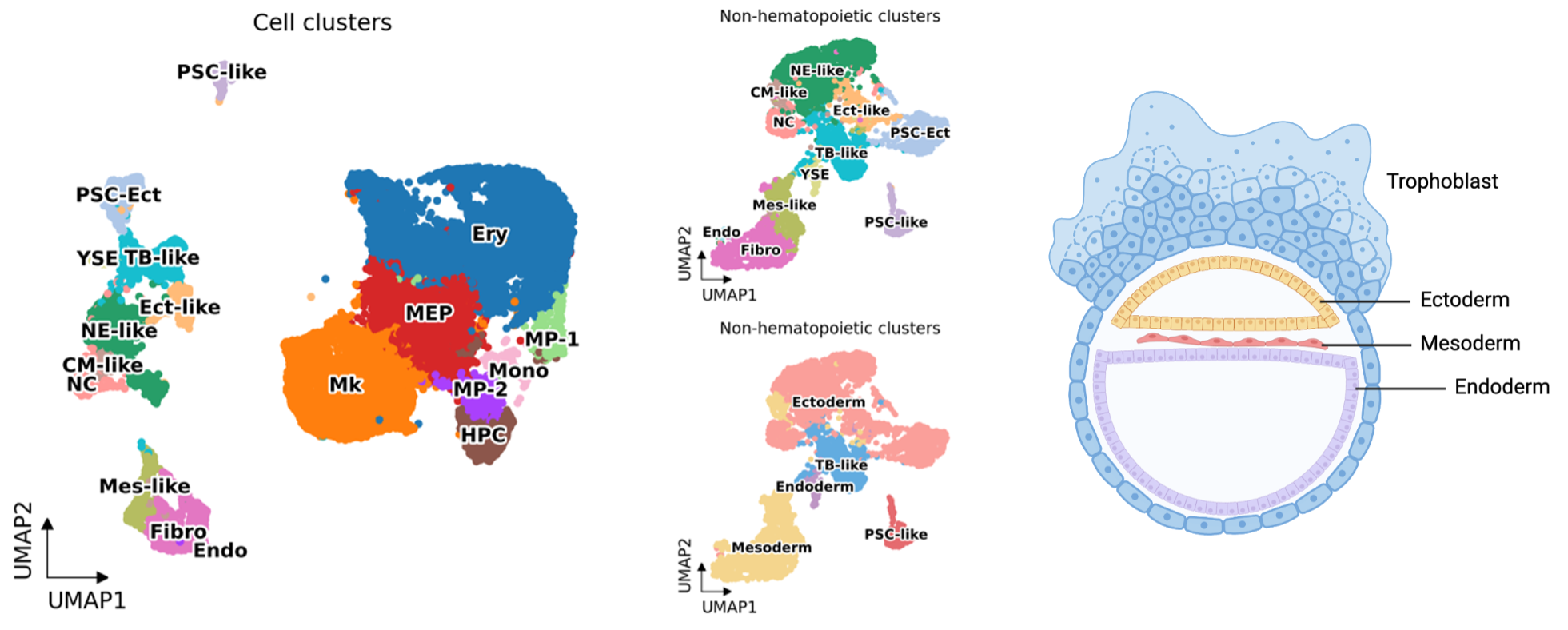 HEMO followed human embryonic development. Among the cells from scRNA-seq, we annotated eighteen cell clusters, including human developmental lineages and hematopoiesis. HEMO acquired extra-embryonic lineages (trophoblast-like tissues, yolk sac endoderm), ectoderm (pluripotent stem cells with ectoderm specification, ectoderm-like cells, neural ectoderm-like cells, neural crest), and mesoderm (mesoderm-like cells, cardiac mesoderm-like cells, fibroblasts, endothelium).