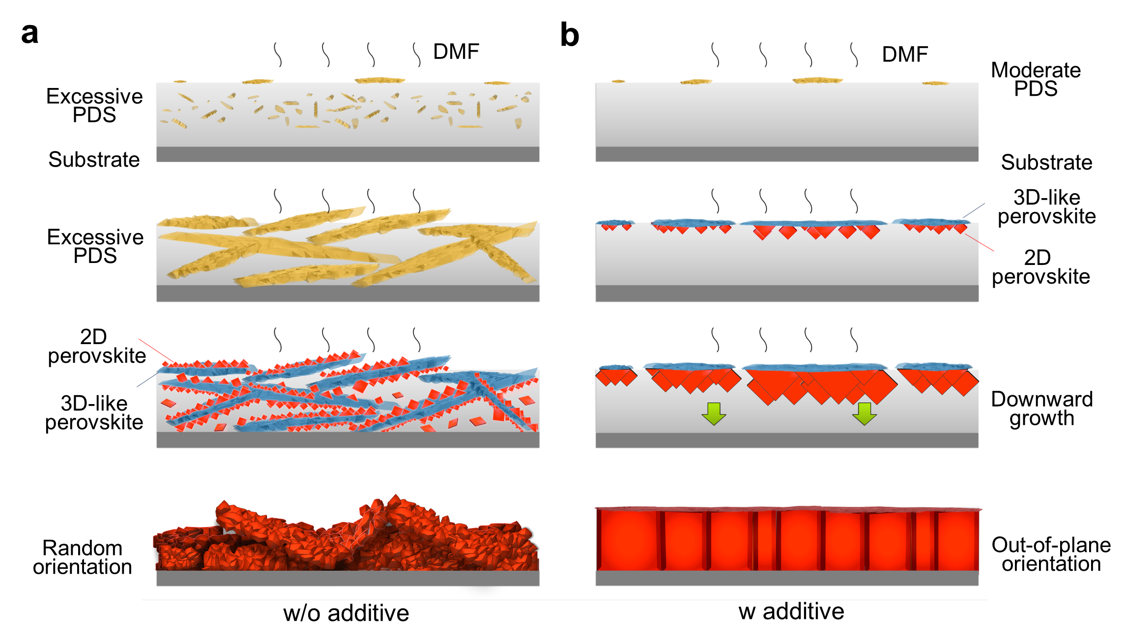Fig. 1. Illustration of preformed PDS and 3D-like perovskites defined nucleation and growth of quasi-2D perovskites from precursor solution without (a) or with (b) excessive AX additives.