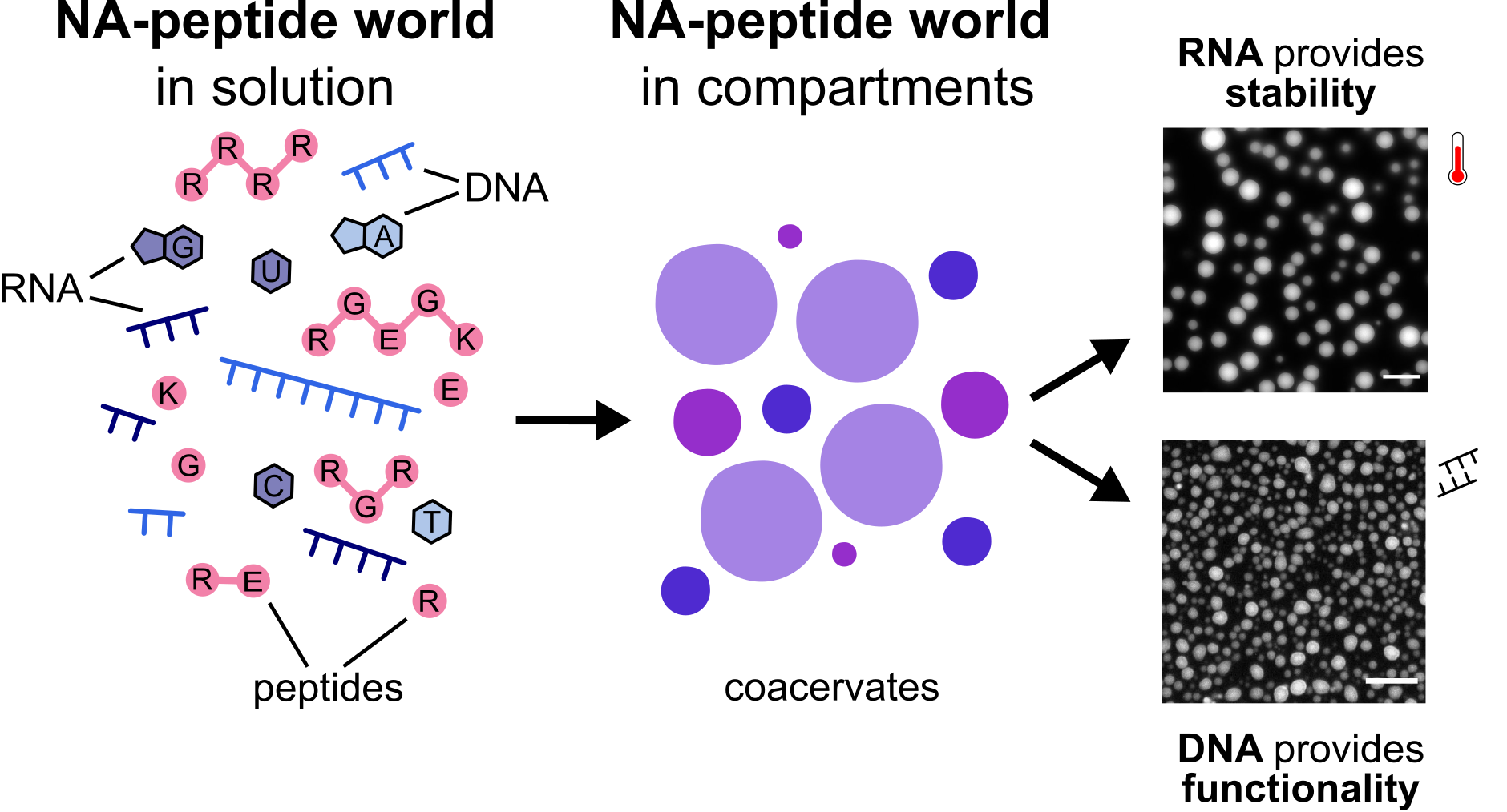 Figure 2. Summary of our results: at early stages of a NA-peptide world, when peptide trimers and nucleic acid octamers would be present, coacervation could have been inevitable. RNA significantly increases the tendency for and the stability of coacervates to salt and heat stress, while DNA improves the mobility of RNA primers in the droplets, and ultimately, reactivity (functionality).