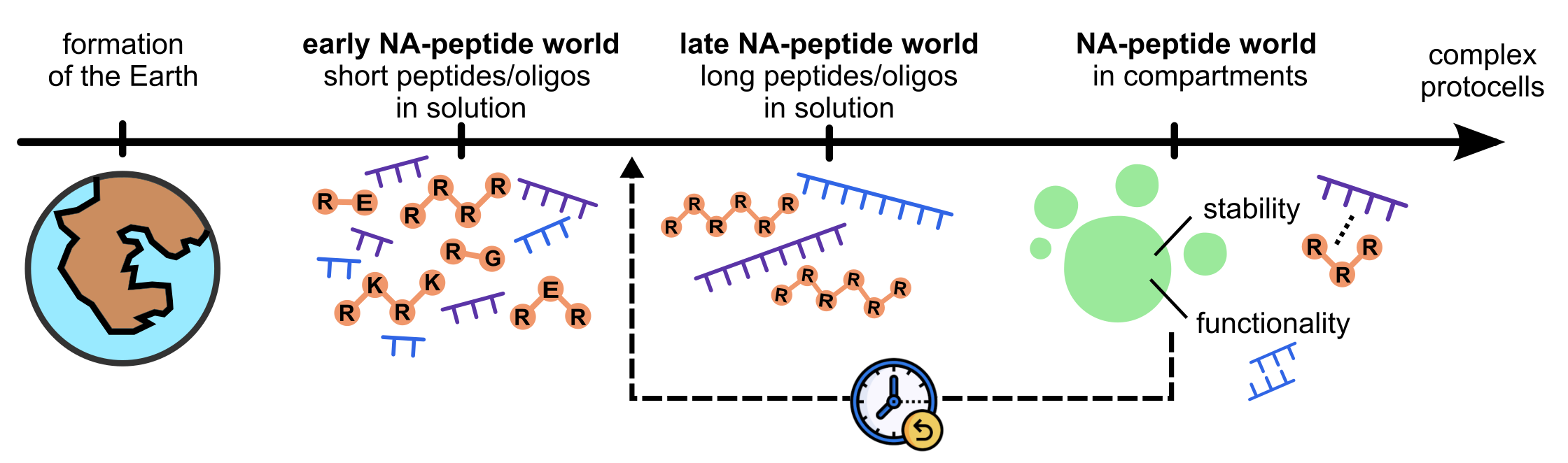 Figure 1. Our envisioned timeline for the early stages of life, adapted from Joyce, Nature (2002) and now anticipating the emergence of compartments to an early nucleic acid-peptide world.