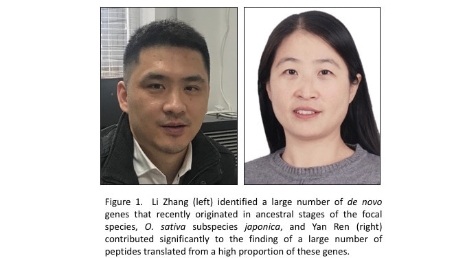In particular, I want to praise the perseverance exhibited by two first co-authors, Li Zhang and Yan Ren (Figure 1). Their tireless efforts allowed them to hunt for signals of ancestral processes that shaped de novo genes stepwise, providing critical evidence that the new genes are really de novo genes that evolved from noncoding ancestors and are translated to novel proteins. Five years ago, Li Zhang showed me a surprising result – he had identified a number of de novo genes with discernable ancestral sequences identified in the genome of the focal species, Oryza sativa ssp japonica, by comparing it to other Oryza and outgroup species. I was astonished by the clear signals indicating that rapid evolution had occurred from their ancestral noncoding sequences to characteristic coding sequences. We predicted that they are translated into novel proteins but did not expect several years of work awaiting us. We were lucky that the experienced team led by Siqi Liu was excited by our observations and bravely joined us in pursuing evidence that they are indeed de novo formed translatable genes. He, with Yan Ren and others, designed protocols specifically working on de novo genes and successfully conducted targeted proteomics experiments. Their powerful results have proved our prediction and thus led us to say farewell to a conventional scavenger approach, which has low efficiency and certainty in finding translational evidence for a de novo gene from often unsatisfactory public databases.
