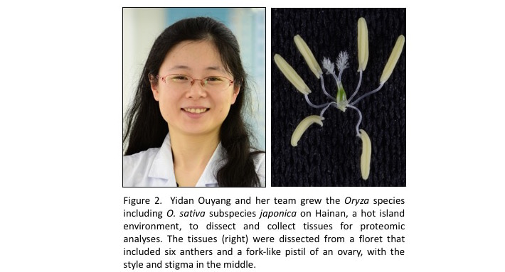 I would also like to share that growing Oryza plants in the field in Hainan, an island close to the equator, is not an easy job. This is a place, I observed, where one can boil a chicken-egg in the sand near the the paddy rice field under sun at noon. It is Yidan Ouyang and her team members that took on the unusual challenge to grow the plants in the hot season of 2017 and dissect many tissues for proteomics analysis. For example, they collected 60,000 tiny anthers (<.5 mm) for ~1 gram of sample, needed for running proteomics analyses. They also ran into trouble trying to deliver the samples to the relatively distant city of Shenzhen, where the team of Siqi Liu was waiting to feed them into their mass-spectrum machines. The airlines refused to transport nitrogen-frozen biological samples. They solved the problem by relocating plants for tissue dissection, allowing the use of a different delivery tool -- I have to omit the details here, as they simply did far more than I can describe in this short blog post (Figure 2).