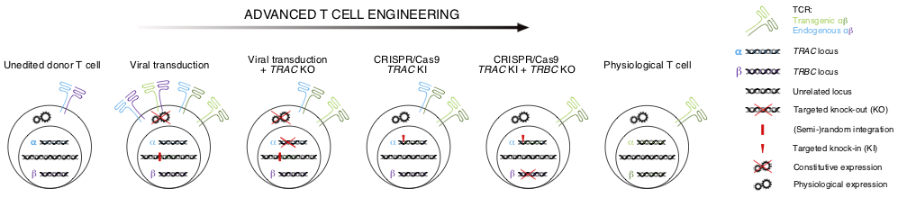 Through viral transduction, a new TCR code is only added on top of the existing, endogenous TCR. Competition between the transgenic and the endogenous TCR, as well as mispairing between individual chains (the TCR is a heterodimeric receptor consisting of an alpha and a beta chain) can cause problems. Researchers therefore started to knock out the endogenous TCR with tools like Zinc finger nucleases and later also CRISPR/Cas9.