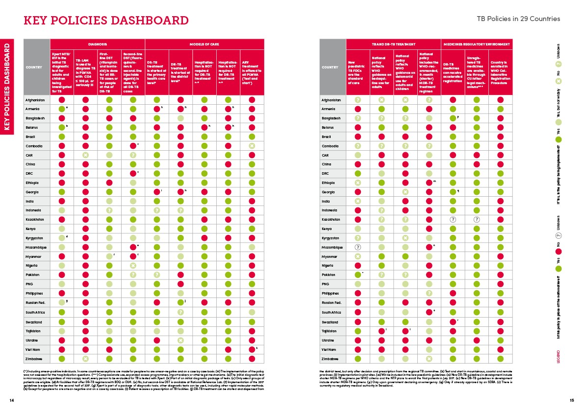 The 1st edition of the report, published in 2014, monitored progress in eight countries; the 2nd edition, published in 2015, covered 24 countries. The 2017 edition of Out of Step surveyed 29 countries that account for over 80% of the global TB burden, and covers five key areas: diagnostics, models of care, treatment for drug-sensitive (DS) and drug-resistant (DR) TB, drug regulation, and prevention. In each of these areas, the survey bench-marked uptake of global policies at the level of the countries, to produce a 'dashboard' (Figure) of how countries are implementing policies and interventions that are known to work.