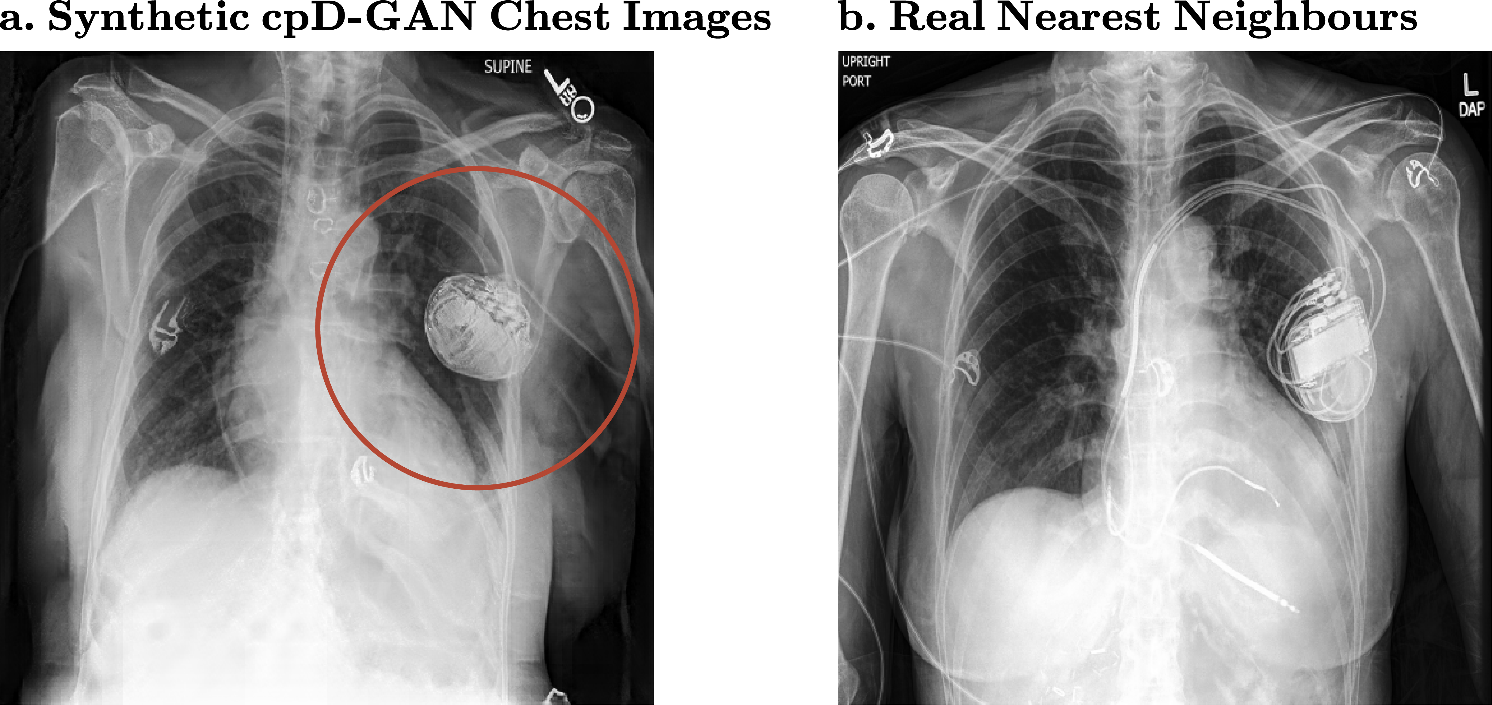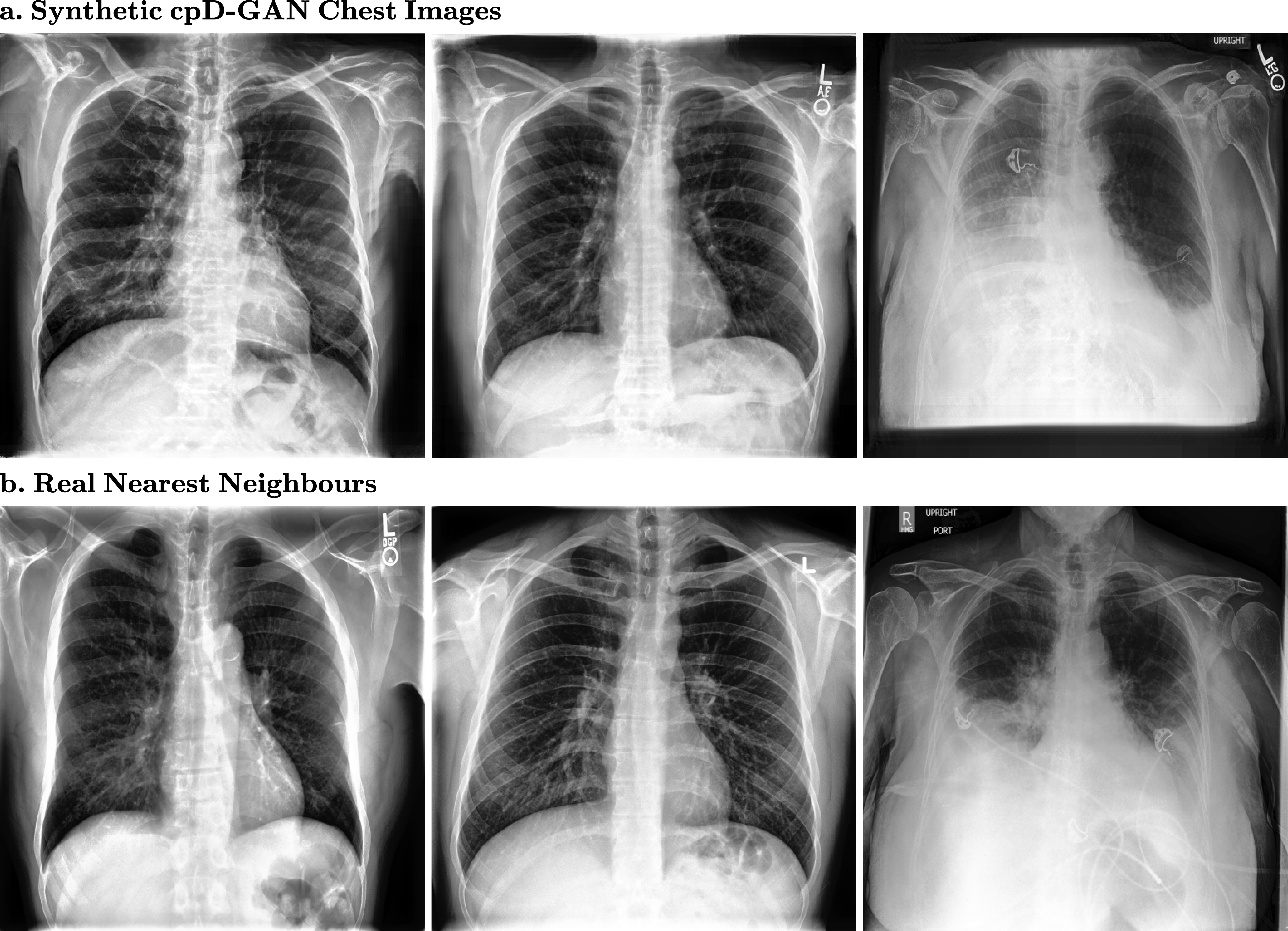 (a.) Synthetic chest x-rays and (b.) closest matching real nearest neighbours at a resolution of 512 x 512 pixels