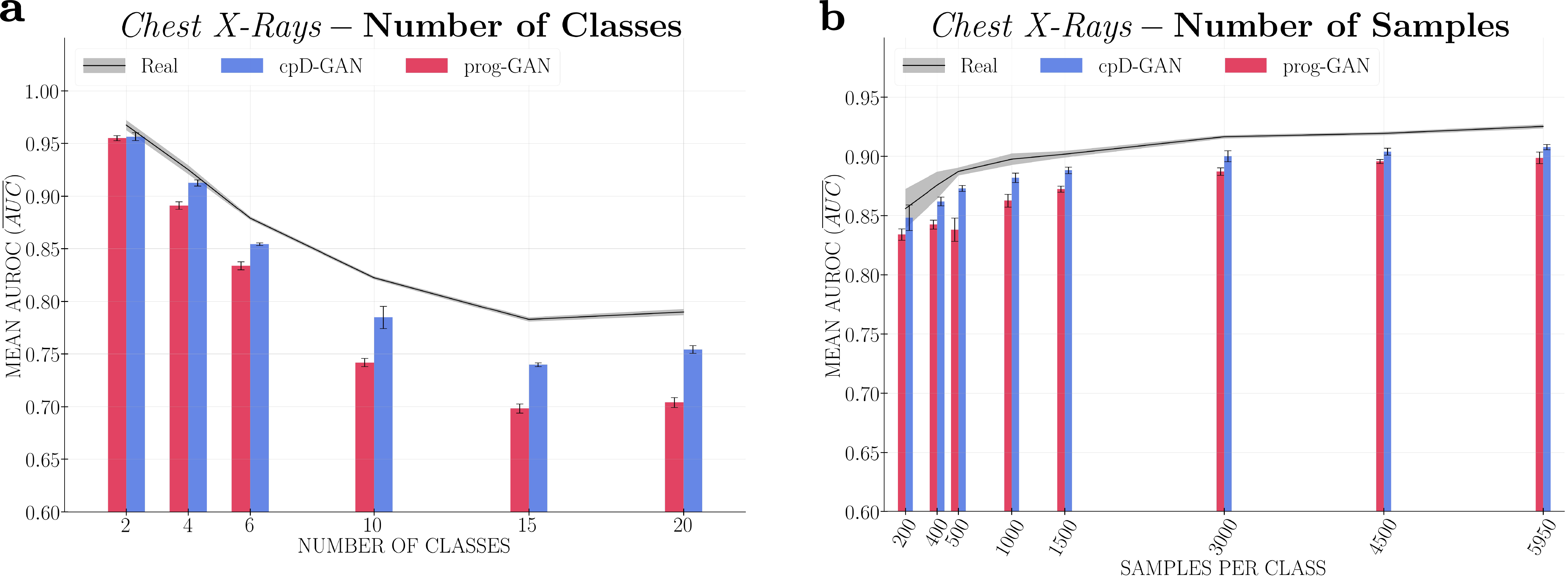 Our major findings: From Fig. 1a we can see that the relative performance for both GAN models increases when we decrease the number of radiology findings present in the chest x-ray dataset. The performance on synthetic data is approaching that of real data at a very low number of classes. This trend shows that GAN models and the generated data quality disproportionately benefit from a smaller label space, thereby confirming the significance of the class conditioning methods.