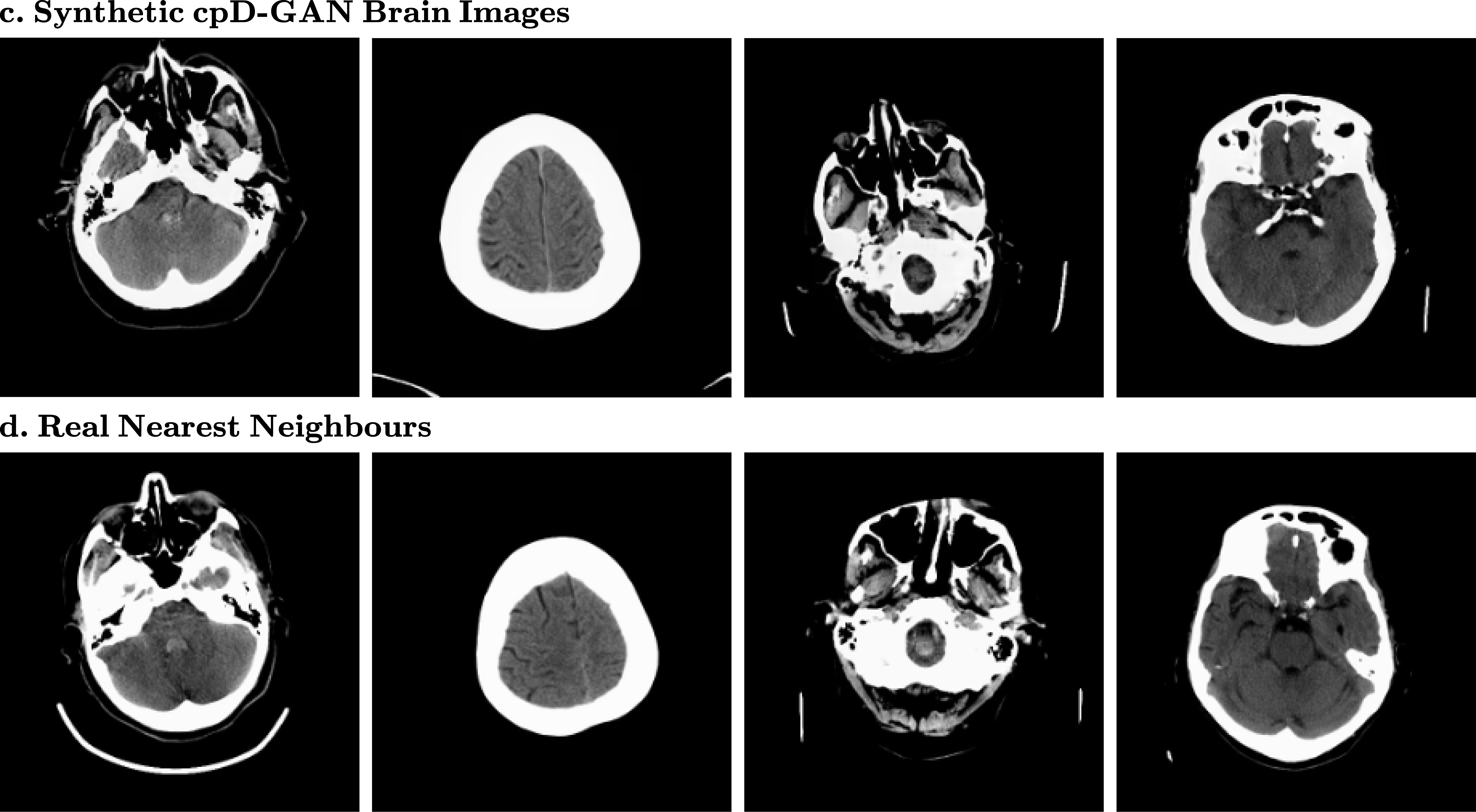 (c.) Synthetic brain CT scans and (d.) closest matching real nearest neighbours at a resolution of 256 x 256 pixels