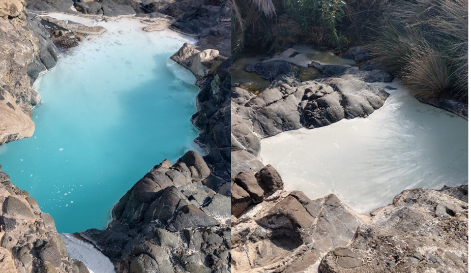 Inorganic carbon limitation becomes tangible at Wadi Qafifa, a site where waters that had been circulating through the subsurface of the Samail Ophiolite, possibly for thousands of years, meet the surface. The result is striking. Waters span from white to brilliant blues as highly reacted waters equilibrated with atmospheric CO2, the latter of which precipitated out of solution as solid white carbonate minerals. Locked in solid form, this carbon is difficult for organisms to access. DIC is further depleted from these waters via abiotic reduction to compounds such as formate (HCOO-) and carbon monoxide (CO). How, then, do autotrophic methanogens, which typically couple H2 with CO2 to generate methane, eke out a living in serpentinizing environments? In particular, how might they overcome CO2 limitation in subsurface environments where access to the atmosphere is limited, DIC has been depleted via prior reactions that caused it to precipitate as carbonate minerals, and high concentrations of H2 may reduce DIC to other compounds such as formate and CO? We hypothesized that autotrophic methanogens have diversified their metabolism to be dependent on abiotic products of serpentinization (i.e., formate and CO) rather than H2 as their sole electron donor. Oxidation of formate or CO would yield cytoplasmic CO2 that could then serve as the oxidant and carbon source for methanogenesis. To investigate this, we traveled to the beautiful country of Oman and drove over a hundred miles from the capital, Muscat, into the looming nearly-black mountains of the Samail Ophiolite. There, we sampled subsurface well waters interfacing harzburgite and gabbro bedrock that had been variably impacted by serpentinization reactions.