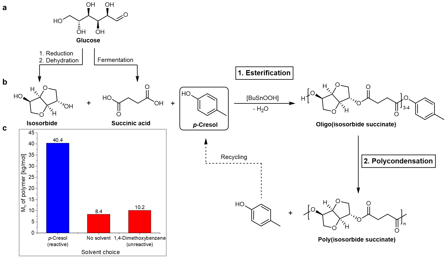 Figure 1. Synthesis of high molecular weight poly(isosorbide succinate) with an aryl alcohol. a Monomer synthesis from glucose, obtainable from either first or second generation biomass. b Synthesis of poly(isosorbide succinate) from succinic acid, isosorbide and p-cresol. c Poly(isosorbide succinate) molecular weights obtained with a reactive solvent (p-cresol), no solvent and an unreactive solvent (1,4-dimethoxybenzene) under comparable reaction conditions.