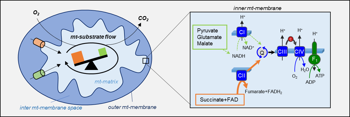 Mitochondria produce the “energy current” ATP by a stepwise oxidation of various substrates during a process called oxidative phosphorylation (OXPHOS) which takes place at the inner mitochondrial membrane. During OXPHOS, electrons resulting from metabolite oxidation are fueled into a mega-complex called “electron-transfer” (ET) system which is composed of a battery of serially connected protein complexes. Electrons enter the ET-system either via Complex I (CI) or Complex II (CII), depending on substrate type. Because the process of OXPHOS consumes oxygen, we can monitor the mitochondrial turnover of cellular substrates in a sample by measurement of oxygen changes in a closed system via a method called High-Resolution Respirometry (HRR). We recently developed a method to assess OXPHOS via HRR in native prostate tissue samples to measure the effect of various substrates on mitochondrial energy production using an instrument that was developed, and is still produced, here in Innsbruck.
