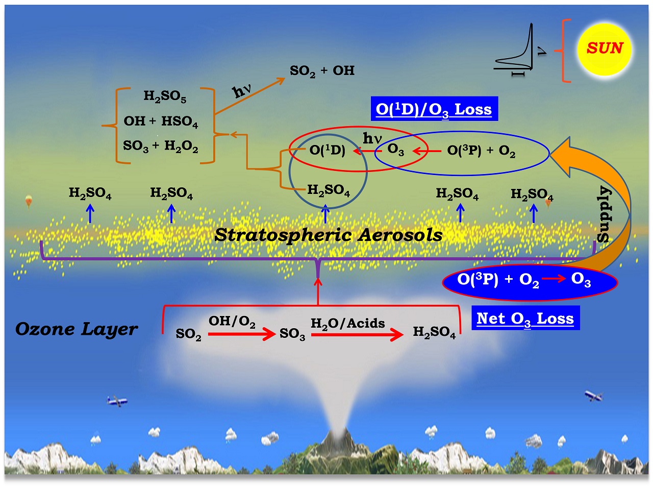 Fig. 1: Interpretation of Sulfuric Acid Decomposition Chemistry Concerning Ozone Depletion and Healing after a Strong Volcanic Eruption (More Information)