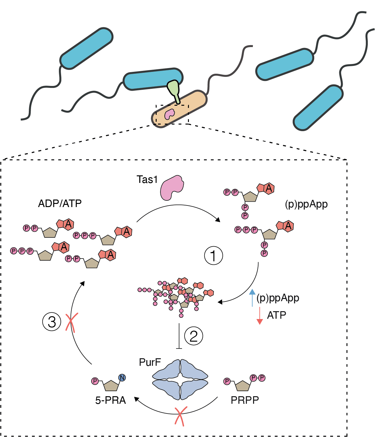Because (p)ppApp is structurally similar to (p)ppGpp we also wondered if in addition to depleting essential adenosine nucleotides, (p)ppApp could also act as a ligand for any of the known (p)ppGpp targets in the bacterial cell. In early 2019, I visited the Laub lab to learn from and work with Boyuan to address this idea. During this time, we focused on PurF, a purine biosynthesis enzyme that Boyuan had previously found to be inhibited by (p)ppGpp5. We were able to show that ppApp similarly binds and inhibits the activity of PurF suggesting that the accumulation of (p)ppApp not only results in a collapse of the metabolic output of the cell, but also results in inhibition of purine biosynthesis. Therefore, Tas1 likely uses a dual-pronged attack to not only deplete cells of ATP but also inhibit synthesis of this nucleotide to prevent cell recovery (Fig. 2).