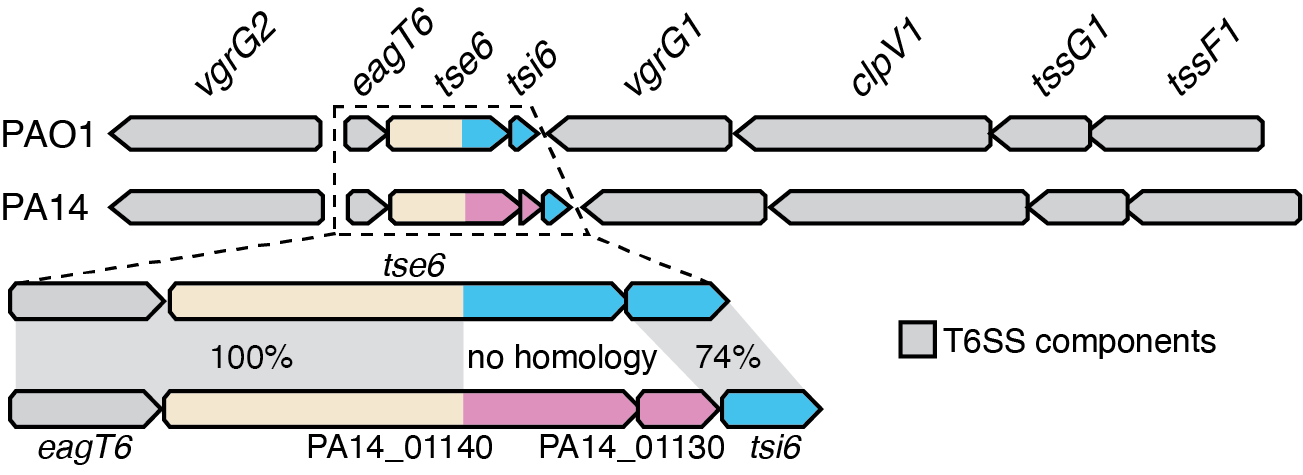 Figure 1. Comparison between the tse6-tsi6 and the PA14_01140-PA14_01130 effector-immunity pairs from P. aeruginosa strains PAO1 and PA14, respectively. Τhe known toxin-immunity-encoding regions of tse6-tsi6 and the predicted toxin-immunity-encoding regions of PA14_01140-PA14_01130 are shown in blue and pink, respectively. Genes encoding T6SS components are shown in gray.