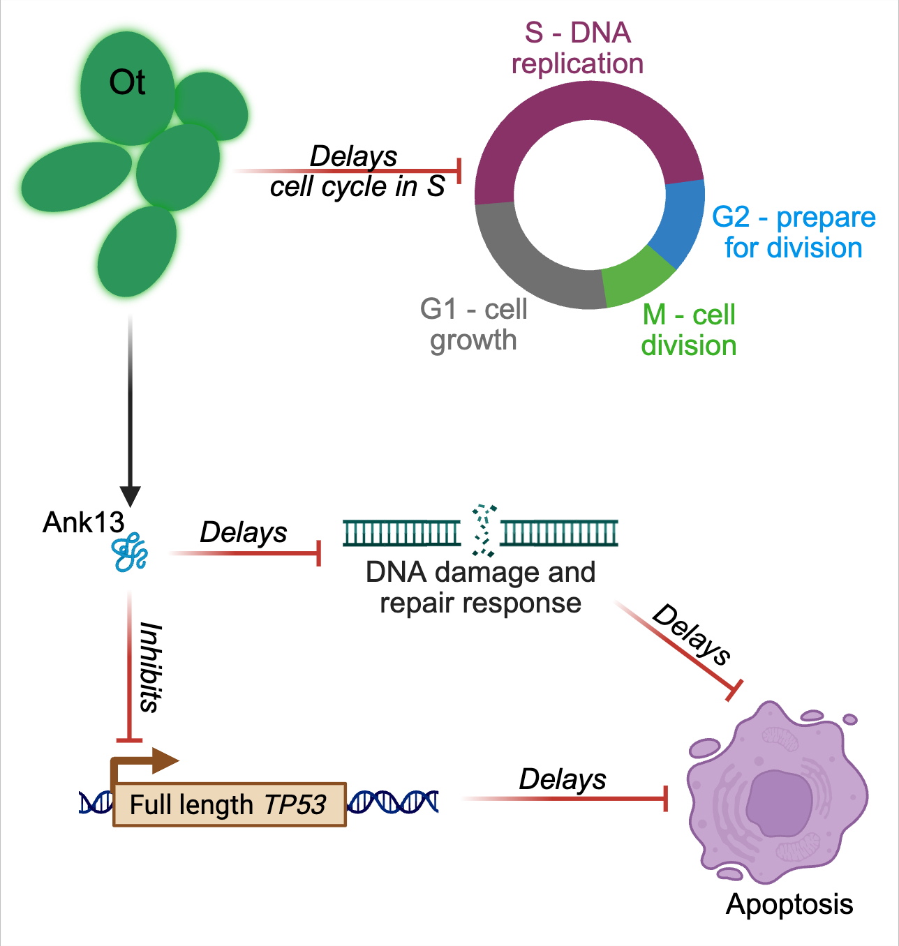 p53 controls several different host cell processes vital to homeostasis. We assessed if O. tsutsugamushi infection has an impact on these pathways including host cell proliferation and the cell cycle, DNA damage repair responses, and apoptosis. p53 inhibits host proliferation and the cell cycle at various checkpoints, thus we expected that proliferation would be uncontrolled during Orientia infection. However, we observed the opposite. O. tsutsugamushi delays host cell proliferation in the DNA replication phase of the cell cycle for reasons that are currently unclear. Next, we determined if the DNA damage repair response is altered during infection. Interestingly, infected cells do not exhibit DNA damage or mount a repair response until the bacterial burden is high. Moreover, Orientia inhibits genotoxicity in the presence of the DNA damaging anti-cancer therapeutic, etoposide. In congruence with these data, O. tsutsugamushi also inhibits apoptosis even when DNA damage is induced until late infection. These findings are two-fold: 1) O. tsutsugamushi impedes TP53 expression and prohibits genotoxicity and programmed cell death; 2) the lack of p53 convecably allows Orientia to fine-tune critical host processes, like the host cell cycle, to protect its niche and support replication. O. tsutsugamushi protein expression is necessary to get rid of p53. We presumed that a bacterial effector protein is involved. Fortunately, we had previously identified an ankyrin repeat-containing effector, Ank13, that globally modulates host cell gene expression including TP53. We confirmed that Ank13 reduces TP53 and p53 as well as protects against genotoxicity and apoptosis.