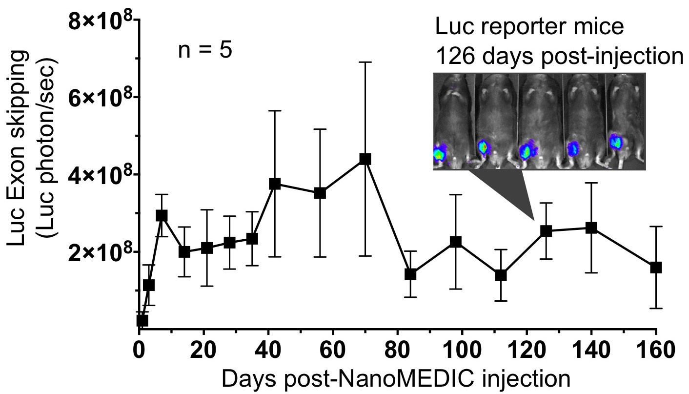 Importantly, NanoMEDIC worked in vivo. We were able to induce exon skipping in luciferase reporter mice we newly generated, and in mdx mice, which is a well-known Duchenne muscular dystrophy mouse model with a premature stop codon in exon 23.